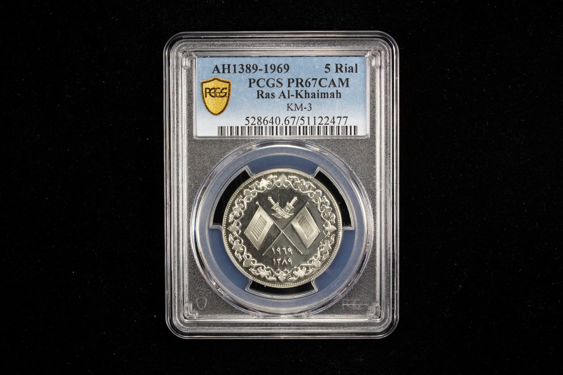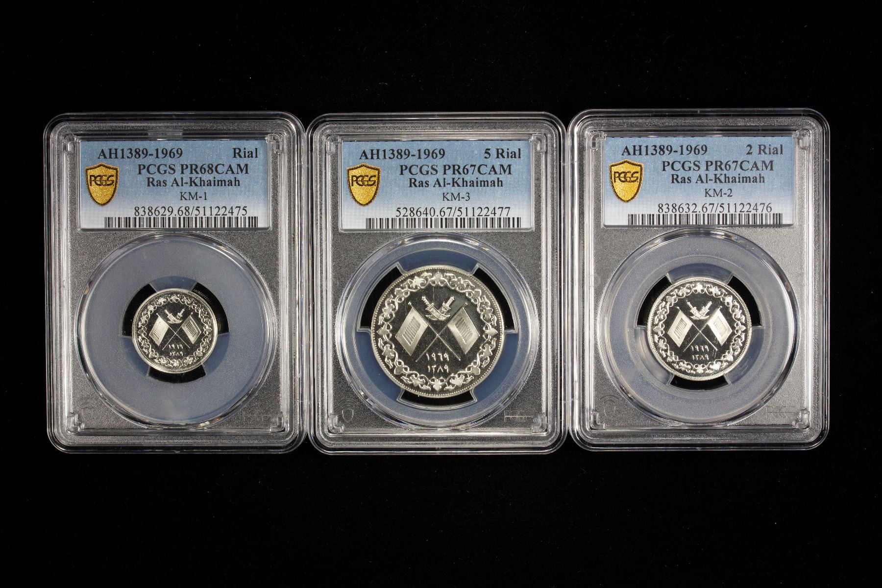 RAS AL KHAIMA: Saqr Bin Muhammad al-Qasimi, 1948-2010, 3-coin proof set, 1969/AH1389, KM-PS1, SET of 3 silver coins all graded by PCGS including KM-1 (1 riyal) PR-68CAM, KM-2 (2 riyals) PR-67DCAM, and KM-3 (5 riyals) PR-67CAM, a nice matched set with brilliant reflective surfaces, with seal from original packaging, set of 3 coins.