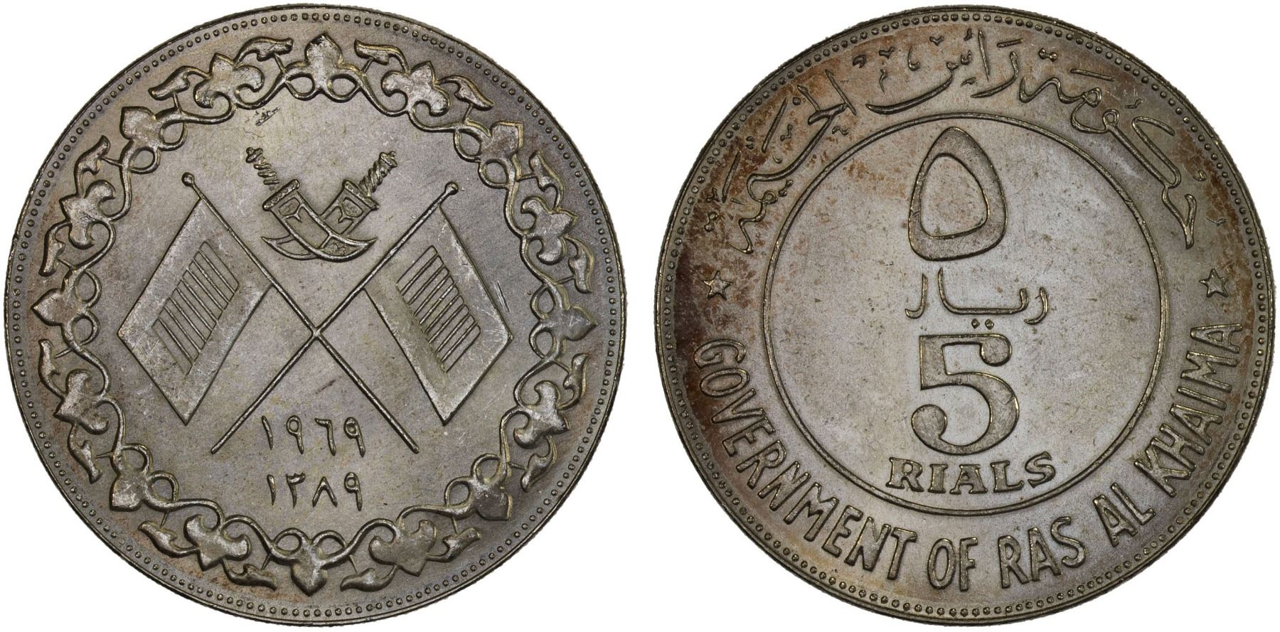 RAS AL KHAIMA: Saqr Bin Muhammad al-Qasimi, 1948-2010, AR 5 riyals, 1969/AH1389, KM-3, crossed flags, fully lustrous, Choice UNC, ex Dr. Wolfgang Schuster Collection.