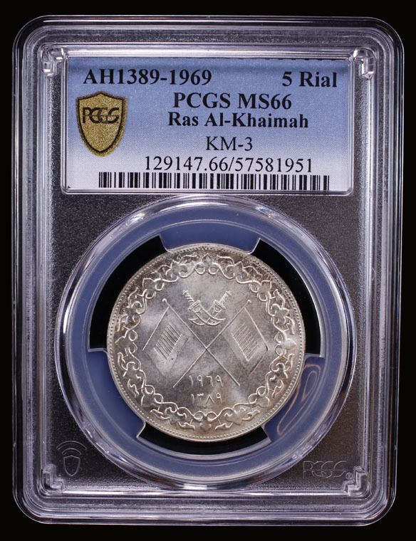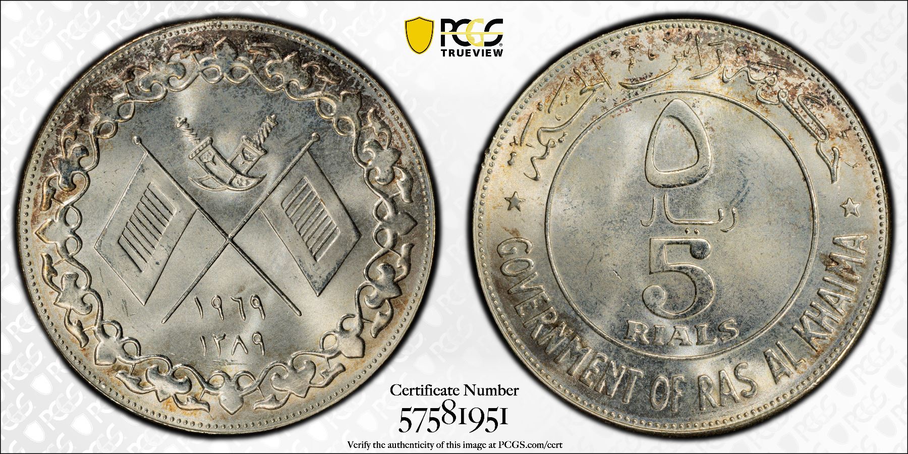 RAS AL KHAIMA: Saqr Bin Muhammad al-Qasimi, 1948-2010, AR 5 riyals, 1969/AH1389, PCGS MS66