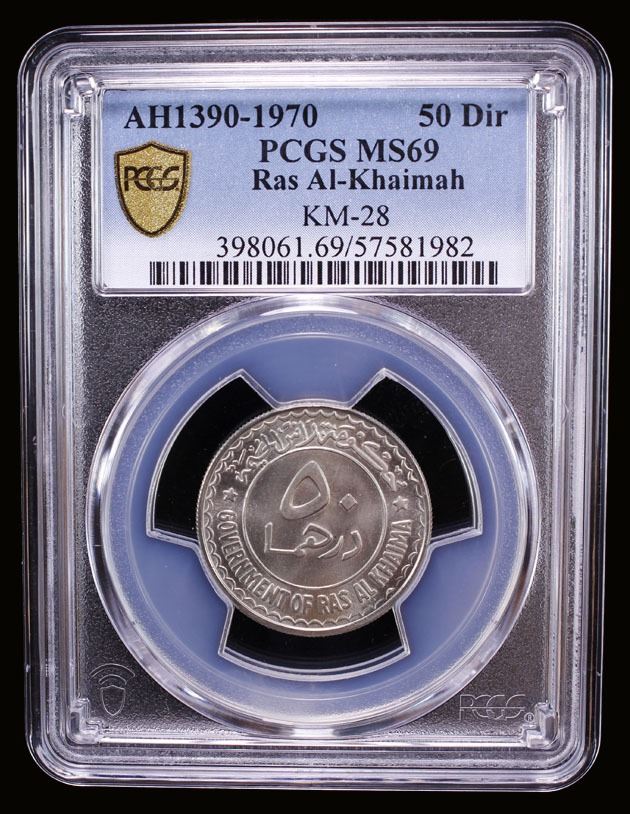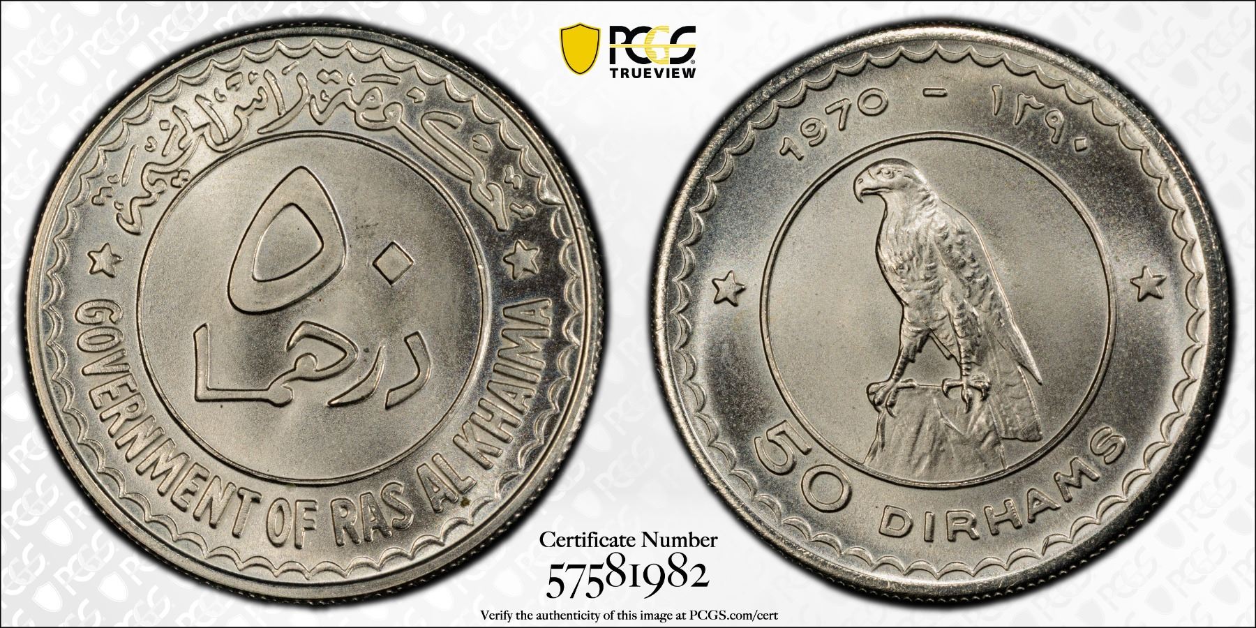 RAS AL KHAIMA: Sheikh Saqr bin Muhammad, 1948-2010, 50 dirhams, 1970/AH1390, PCGS MS69