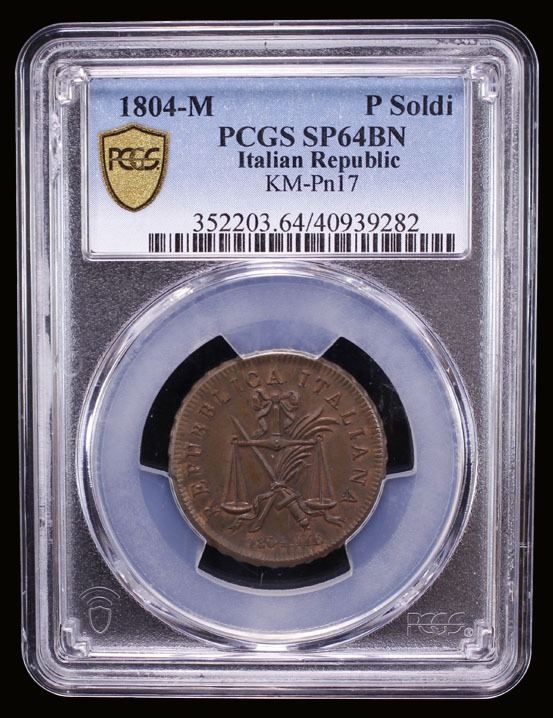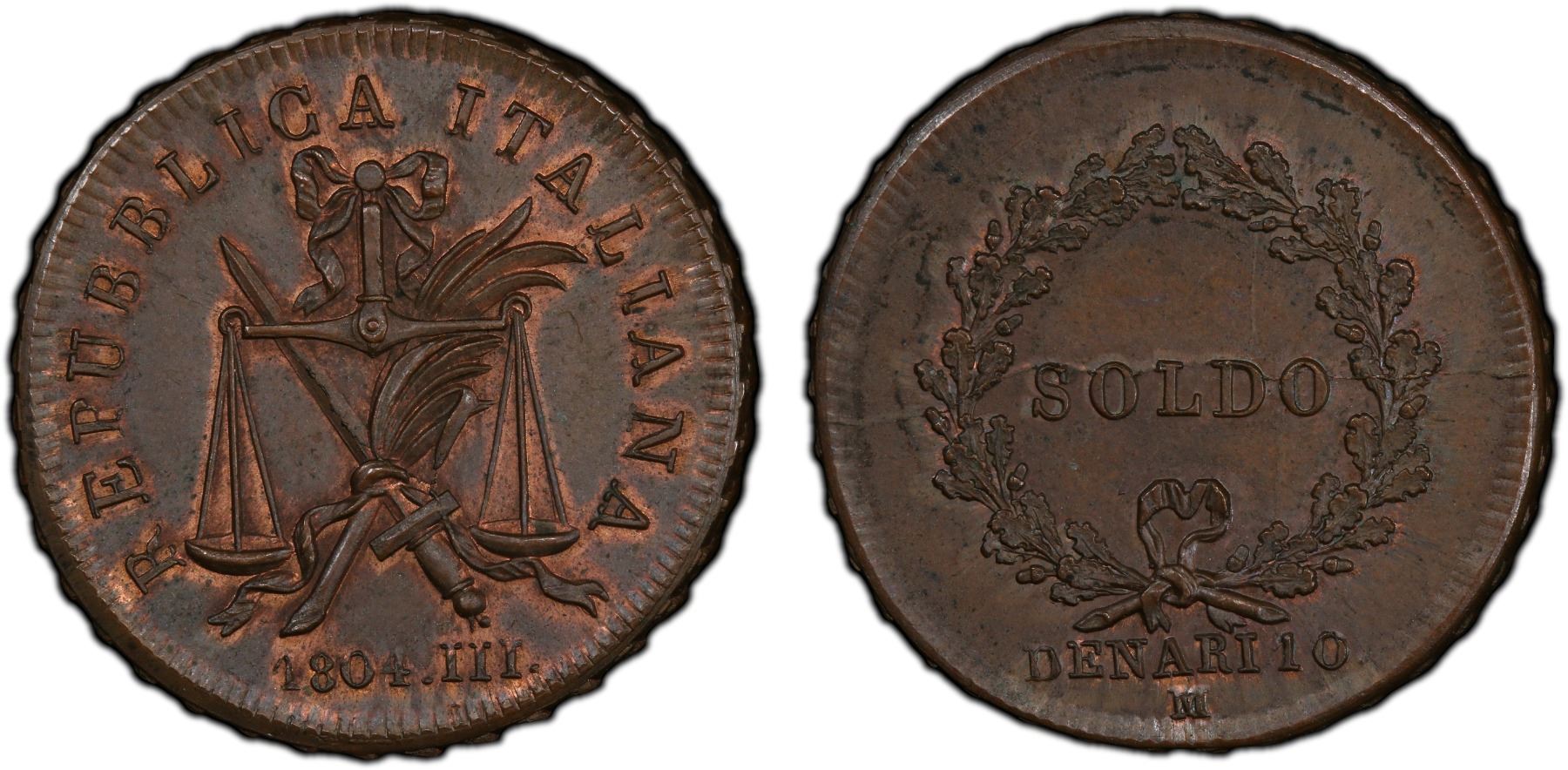 REPUBLIC OF ITALY: Napoleon, President, 1802-1805, AE soldo, Milan, 1804 year III, KM-Pn17, a wonderful quality red lustrous example of this scarce pattern type! PCGS graded Specimen 64 BN. The Italian Republic was a short-lived republic from 1802-1805 located in Northern Italy. Napoleon Bonaparte served as president and its capital was Milan.