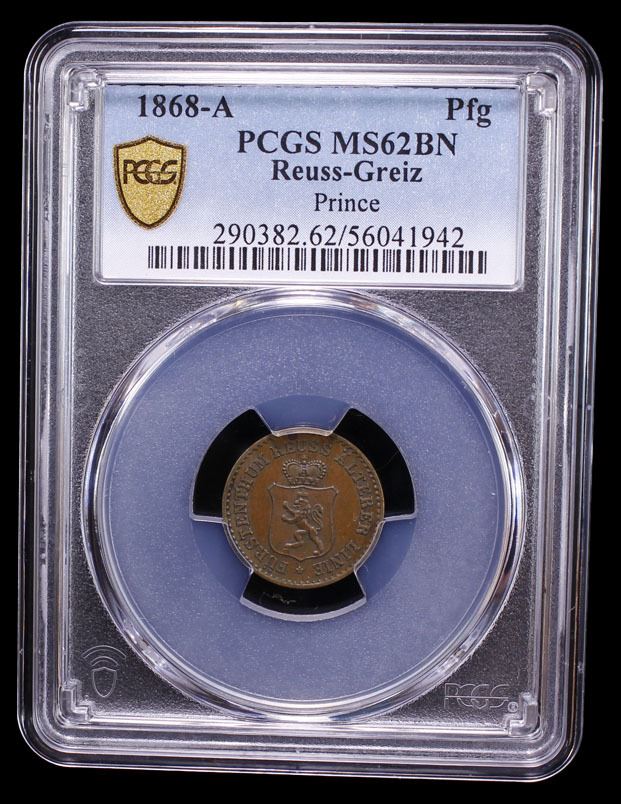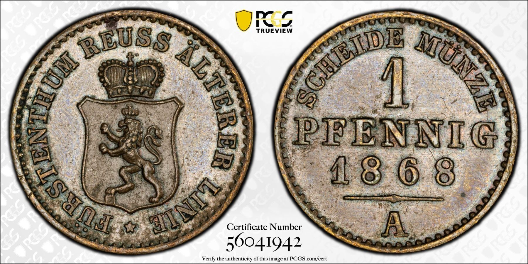 REUSS-GREIZ: Heinrich XXII, 1867-1902, AE pfennig, 1868-A, KM-117, AKS-18, an attractive example, PCGS graded MS62 BN.