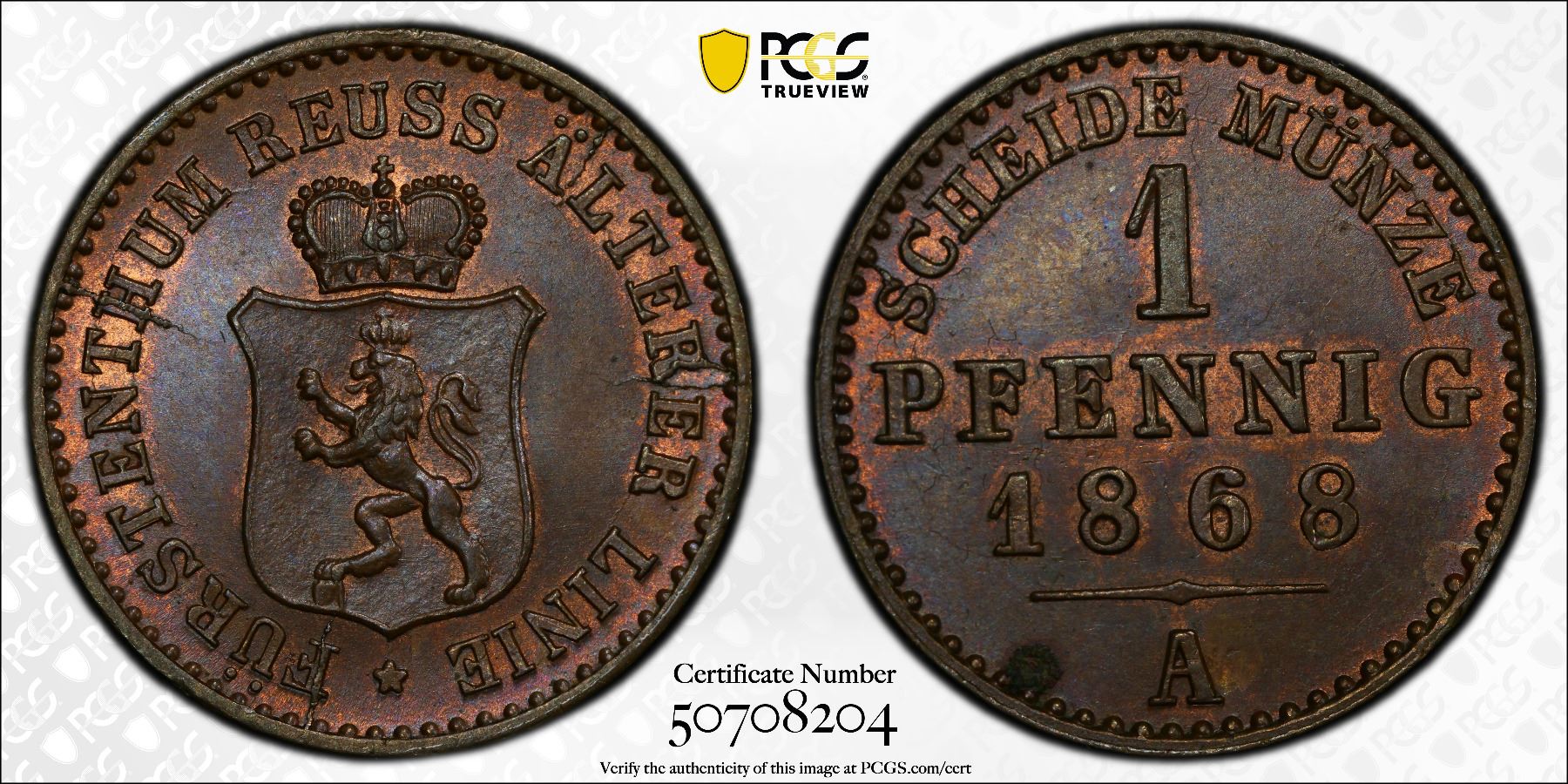 REUSS-GREIZ: Heinrich XXII, 1867-1902, AE pfennig, 1868-A, PCGS MS63 BN