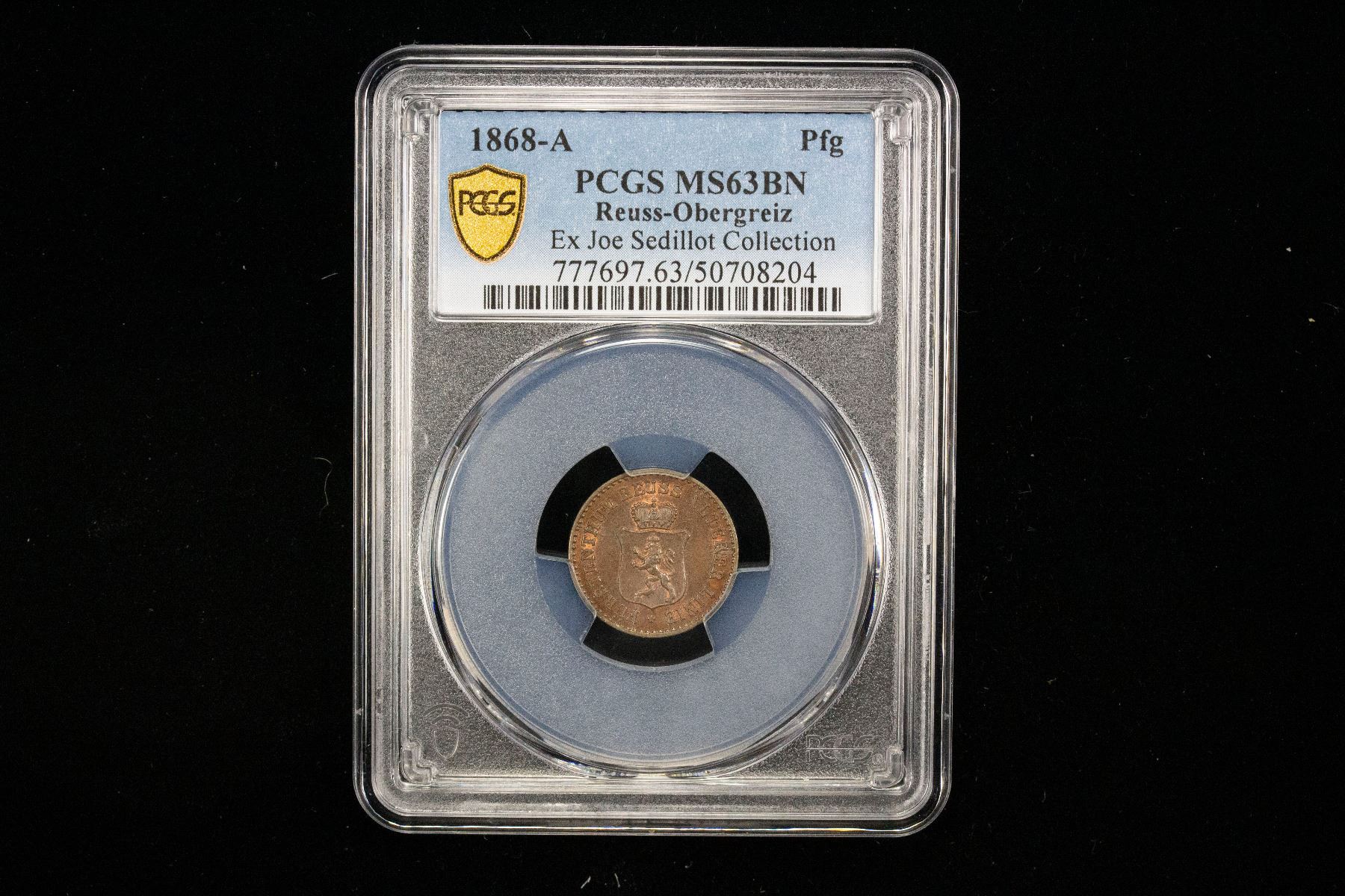 REUSS-GREIZ: Heinrich XXII, 1867-1902, AE pfennig, 1868-A, KM-117, Cr-57, a lovely mint state example! PCGS graded MS63 BN, ex Joe Sedillot Collection.