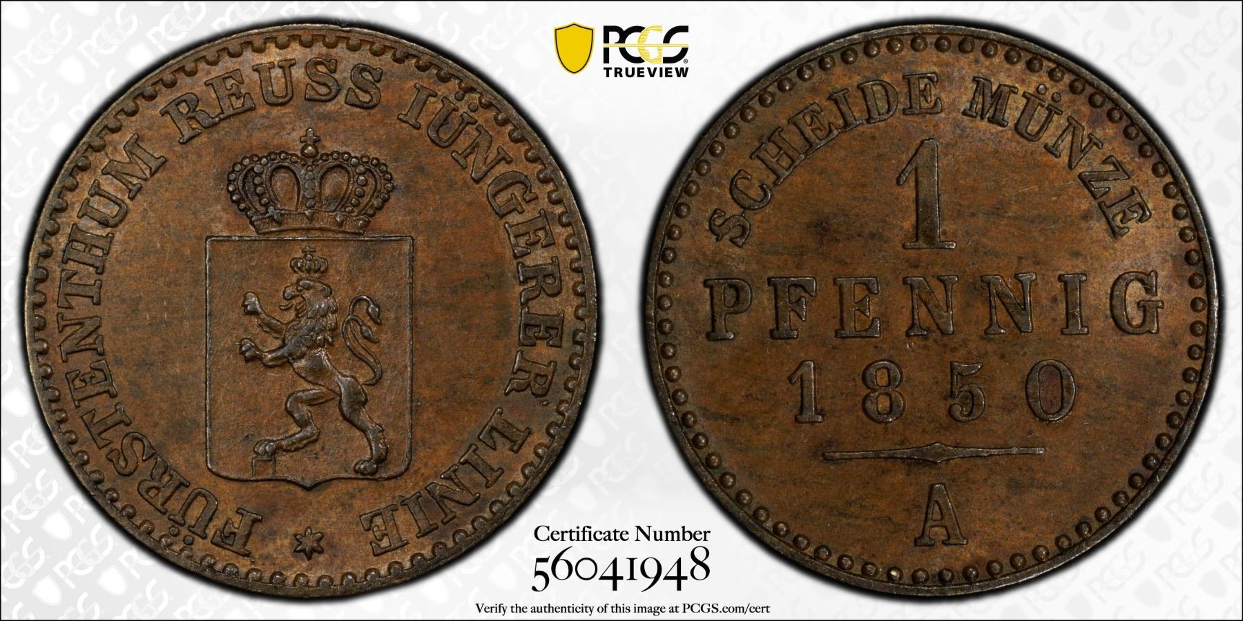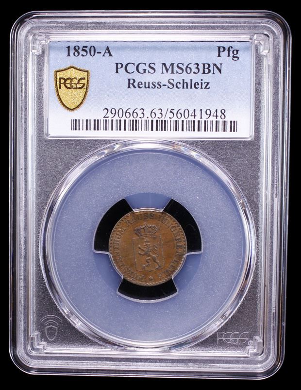 REUSS-SCHLEIZ: Heinrich LXII, 1818-1854, AE pfennig, 1850-A, PCGS MS63 BN