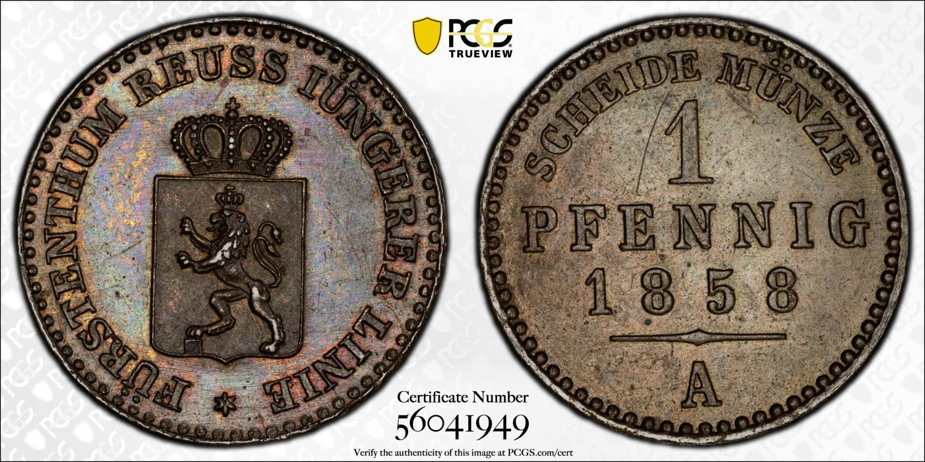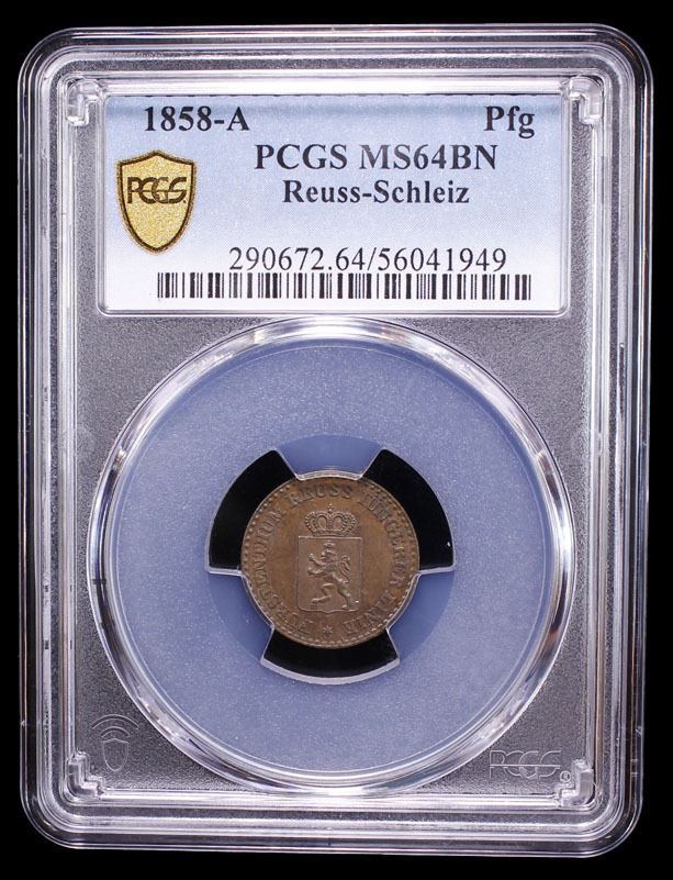 REUSS-SCHLEIZ: Heinrich LXVII, 1854-1867, AE pfennig, 1858-A, PCGS MS64 BN