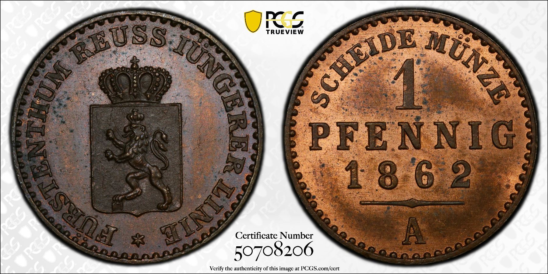 REUSS-SCHLEIZ: Heinrich LXVII, 1854-1867, AE pfennig, 1862-A, PCGS MS65 BN
