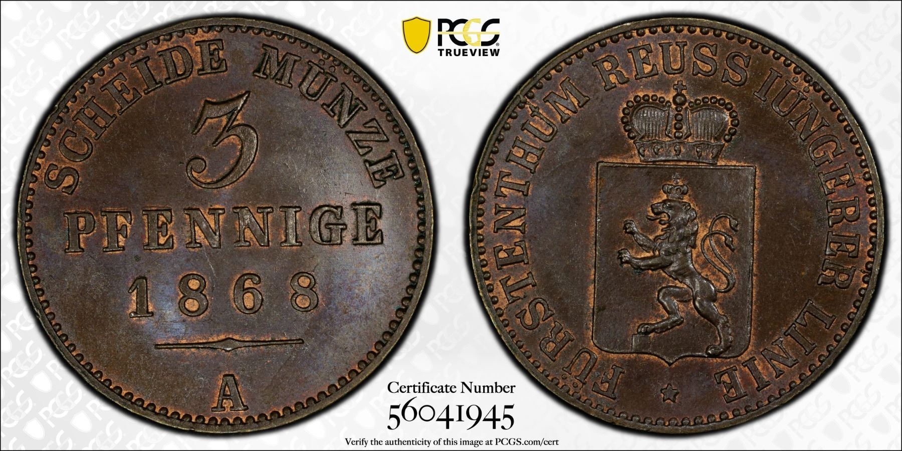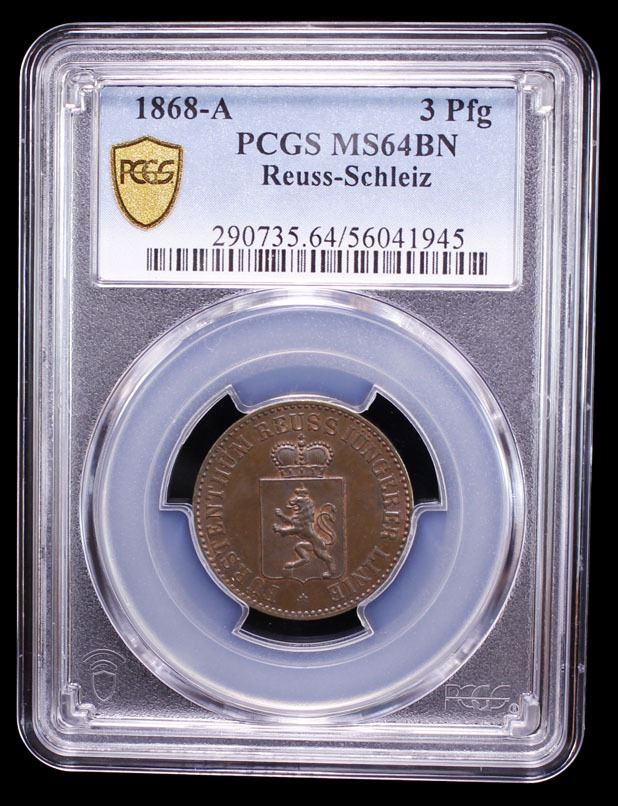 REUSS-SCHLEIZ: Heinrich XIV, 1867-1913, AE 3 pfennig, 1868-A, PCGS MS64 BN
