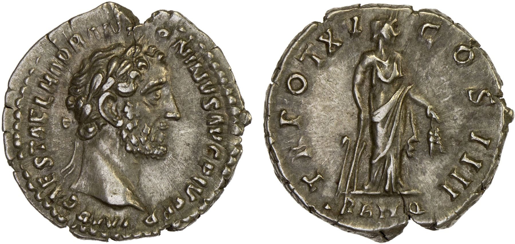 ROMAN EMPIRE: Antoninus Pius, 138-161 AD, AR denarius (3.56g), Rome, 151-152 AD, RIC-218, laureate head right, IMP CAES T AEL HADR ANTONINVS AVG PIVS P P // Tranquilitas standing right, holding grounded rudder and two corn ears, TRANQ in exergue, TR POT XV COS IIII, bold strike, VF-XF, ex Dr. Vincent John Adams Flynn Collection (Noble Numismatics Sale 110, Lot 2818), ex Wayne C. Phillips.
