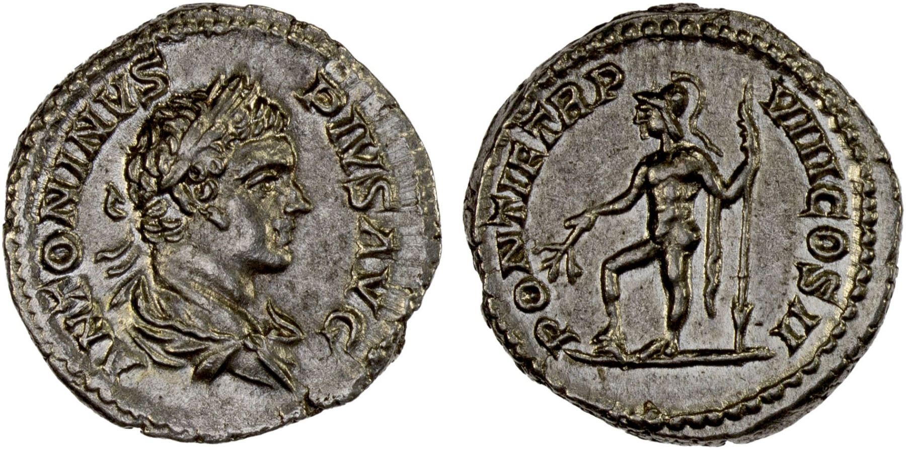 ROMAN EMPIRE: Caracalla, 198-217 AD, AR denarius (3.36g), Rome, 205 AD, RIC-80B, laureate and draped bust right, ANTONINVS PIVS AVG // Mars standing left with right foot on helmet, holding branch and spear, PONTIF TR P VIII COS II, faint hairlines, XF.