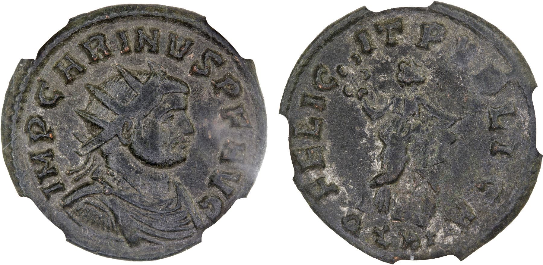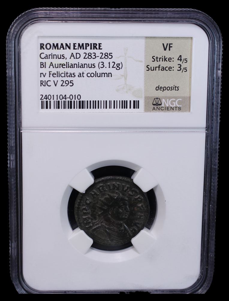 ROMAN EMPIRE: Carinus, 283-285 AD, BI antoninianus (3.12g), Ticinum, RIC-295, radiate, draped, and cuirassed bust right, IMP CARINVS P F AVG // Felicitas standing left with legs crossed, leaning on column, holding caduceus in right hand, FELICIT PVBLICA, QXXI in exergue, light deposits, Strike 4/5, Surface 3/5, NGC graded VF.
