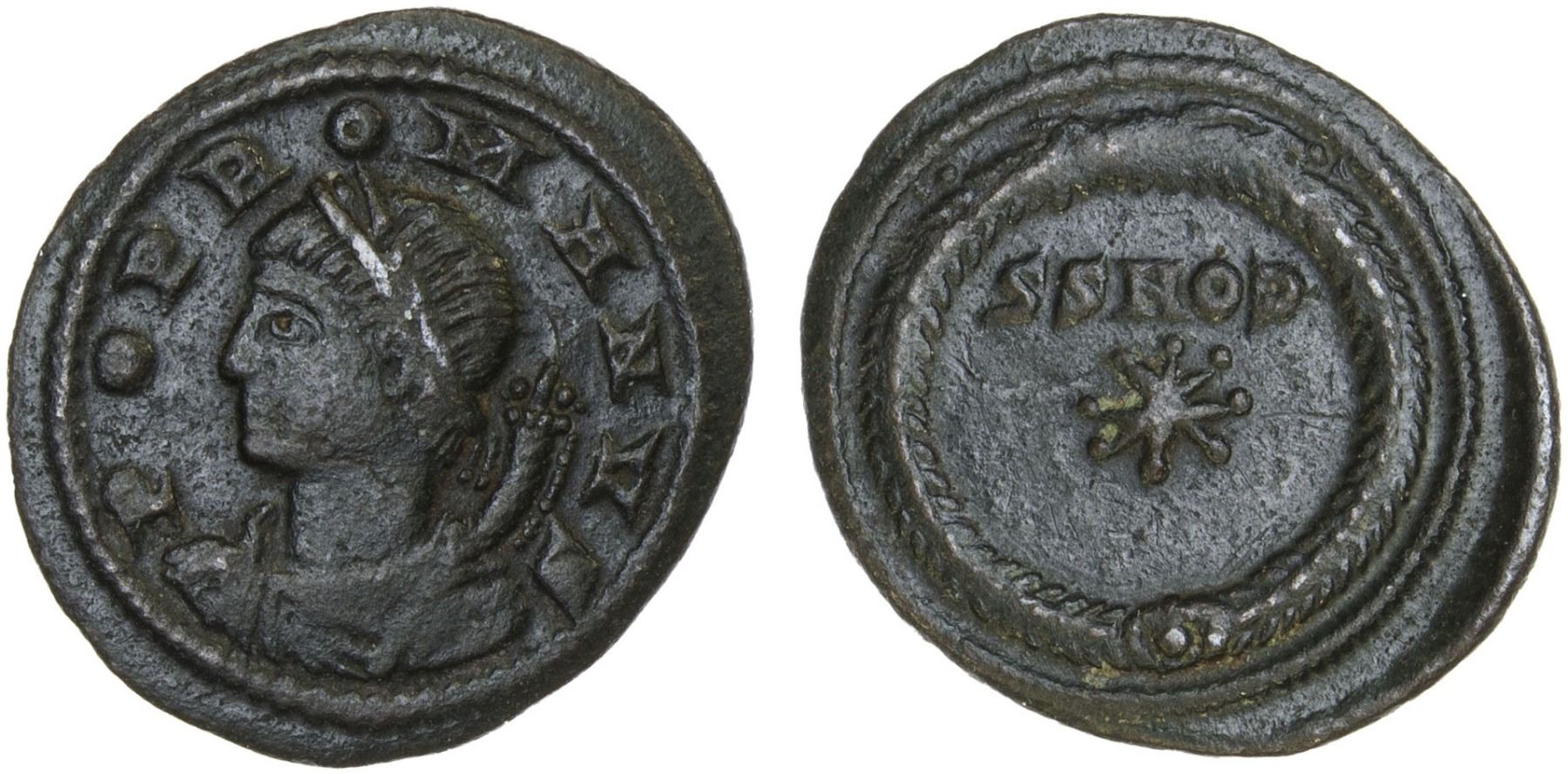 ROMAN EMPIRE: Commemorative Series, AE14 (1.08g), Constantinople, 330 AD, RIC-22, laureate and draped bust of Genius Populi Romanus left, carrying cornucopia on left shoulder // eight-pointed star above CONSS, all within wreath, dark green patina, Choice VF.