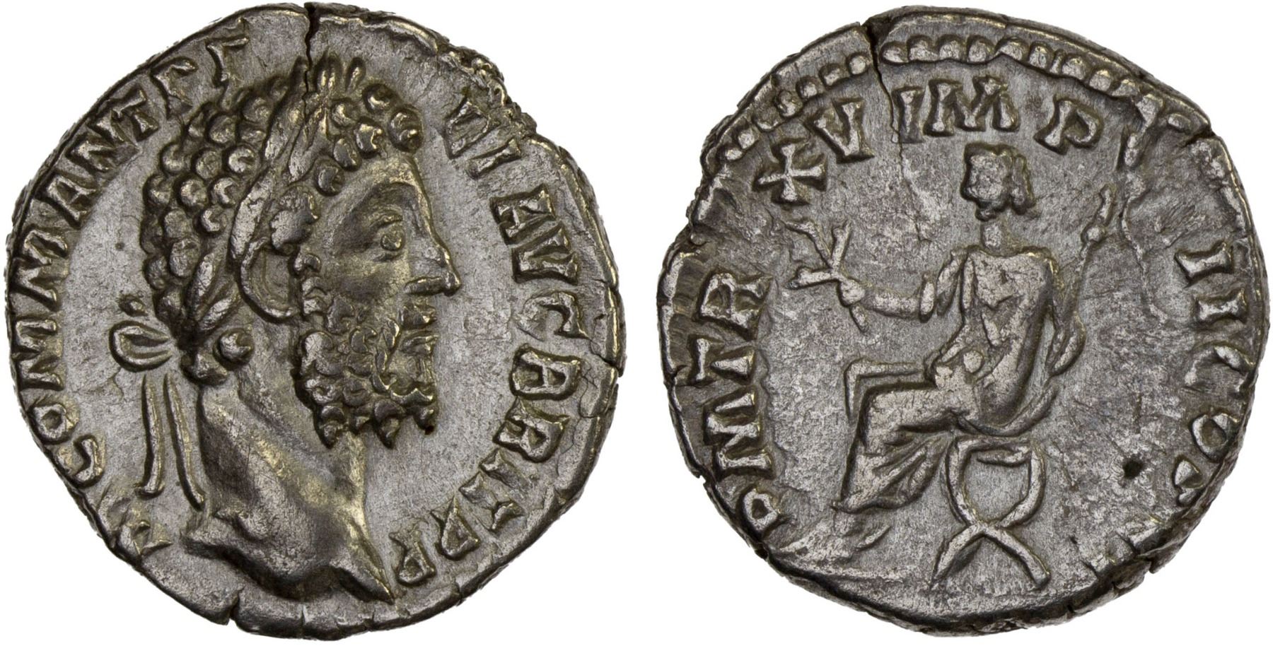 ROMAN EMPIRE: Commodus, 177-192 AD, AR denarius (3.39g), Rome, [188], S-5683, P M TR P XV IMP VIII COS VI, Emperor seated, togate, left on curule chair, holding branch & scepter, strong VF, ex Syed Rabbi Collection.