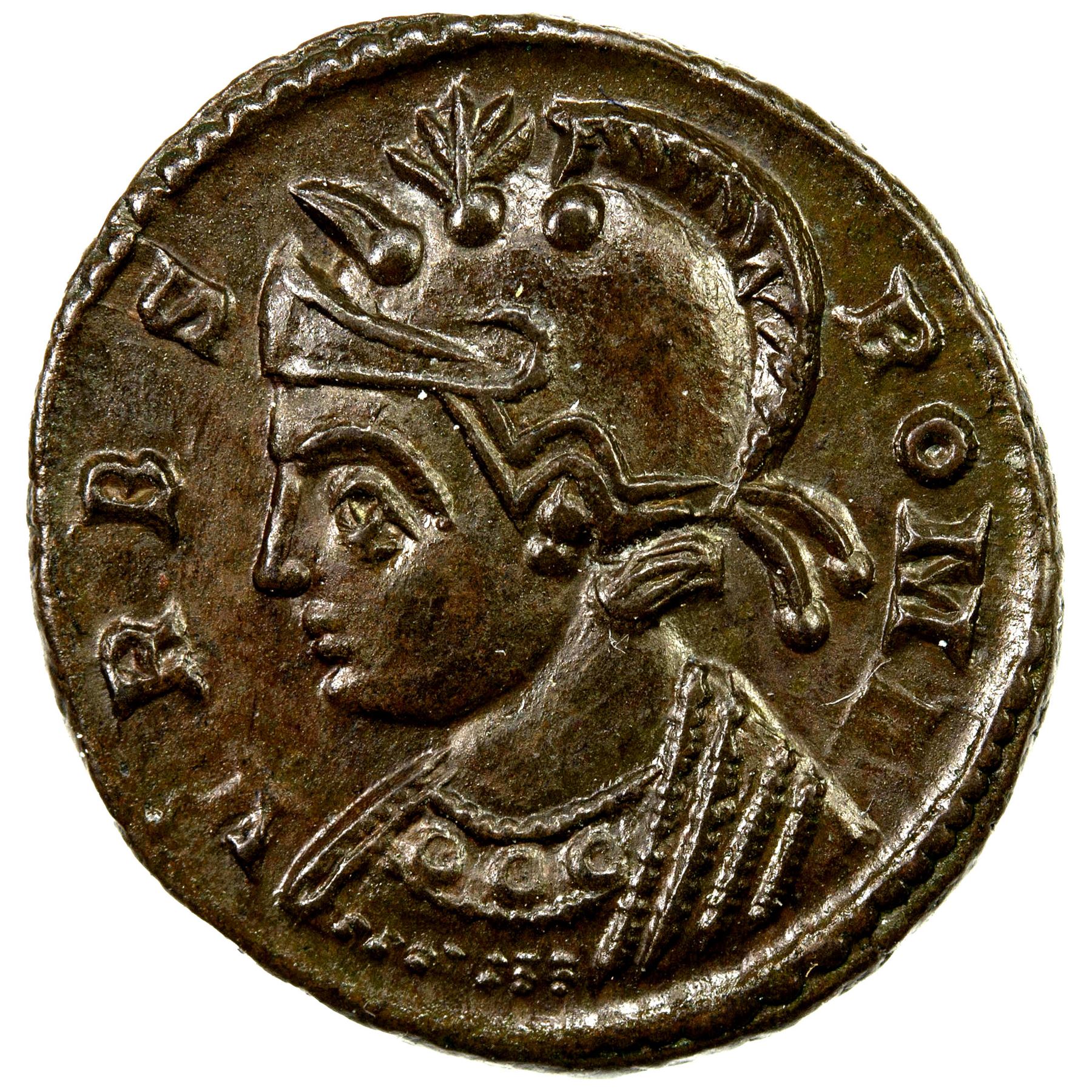 ROMAN EMPIRE: Constantine I, 307-337, AE nummus (2.44g), Lugdunum, 332, RIC-257, commemorative series, helmeted bust of Roma left, wearing imperial cloak, VRBS ROMA // she-wolf standing left, suckling twins, two stars above, dot on crescent and PLG in exergue, excellent strike with nice glossy patina, choice EF.