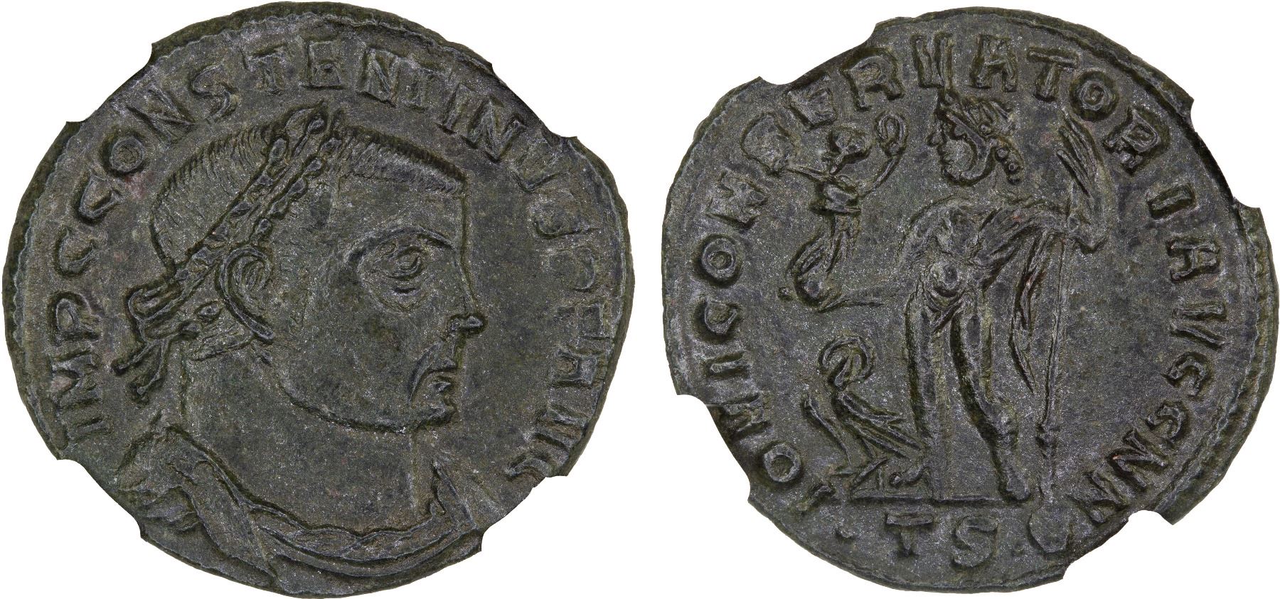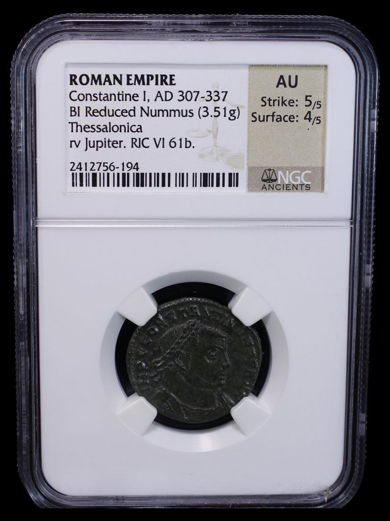 ROMAN EMPIRE: Constantine I 'the Great', 307-337 AD, AE nummus (3.51g), Thessalonica, 321-324 AD, RIC-61b, laureate, draped, and cuirassed bust right, IMP C CONSTANTINVS P F AVG // Jupiter standing left, holding Victory on globe in right hand and scepter in left hand, eagle with wreath to left, IOVI CONSERVATORI AVGG NN, TS in exergue, glossy dark green patina, Strike 5/5, Surface 4/5, NGC graded AU.