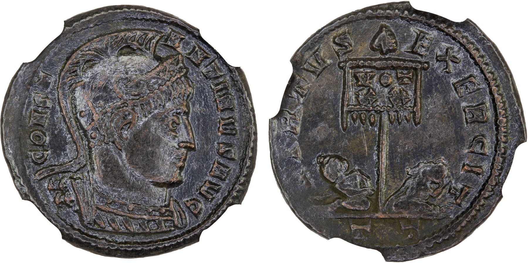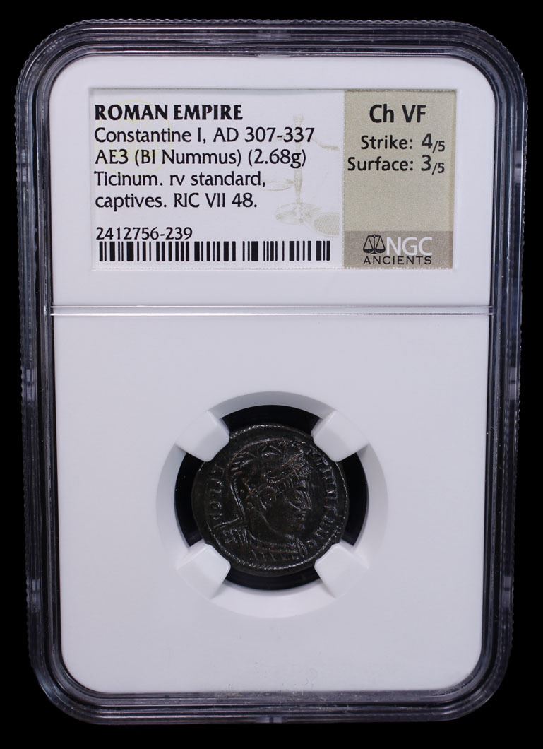 ROMAN EMPIRE: Constantine I 'the Great', 307-337 AD, AE3 (2.68g), Ticinum, 319-320 AD, RIC-114, cuirassed bust right, wearing crested helmet, CONSTANTINVS AVG // standard inscribed VOT/XX, flanked by two seated captives, VIRTVS EXERCIT, TT in exergue, glossy brown patina, Strike 4/5, Surface 3/5, NGC graded Choice VF.