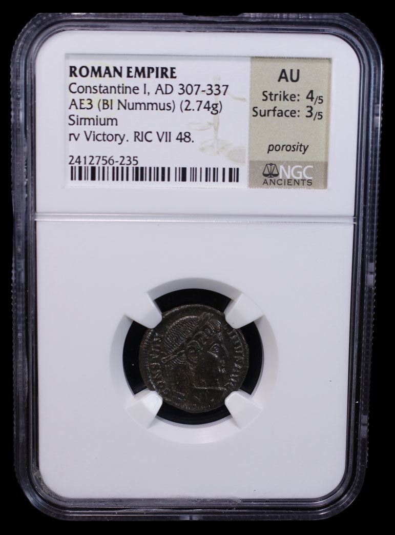 ROMAN EMPIRE: Constantine I 'the Great', 307-337 AD, AE3 (2.74g), Sirmium, 324-325 AD, RIC-48, laureate head right, CONSTANTINVS AVG // Victory advancing right, holding trophy in right hand and palm frond in left hand, spurning seated captive with left foot, SIRM in exergue, attractive glossy brown patina, faint porosity, Strike 4/5, Surface 3/5, NGC graded AU.