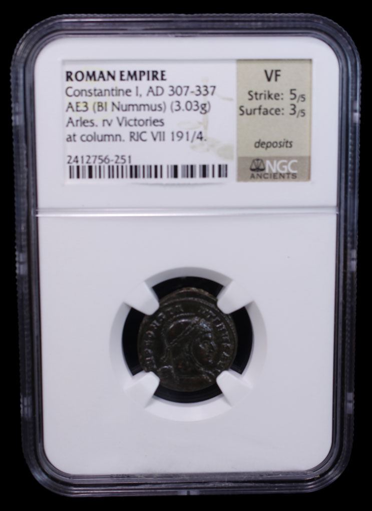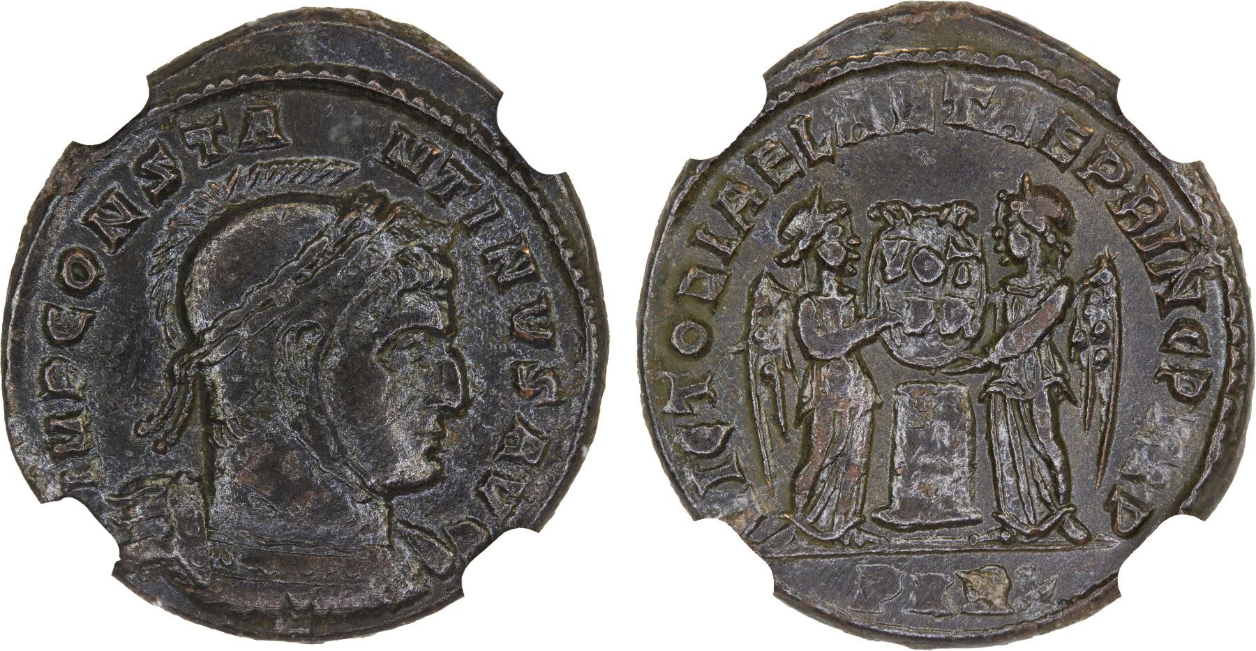 ROMAN EMPIRE: Constantine I 'the Great', 307-337 AD, AE3 (3.03g), Arelate (Arles), 319 AD, RIC-191, helmeted and cuirassed bust right, IMP CONSTANTINVS AVG // two Victories standing vis-à-vis, holding a shield inscribed VOT/PR above column, VICTORIAE LAETAE PRINC PERP, PARL in exergue, a few spots of deposits, glossy dark brown patina, Strike 5/5, Surface 3/5, NGC graded VF.