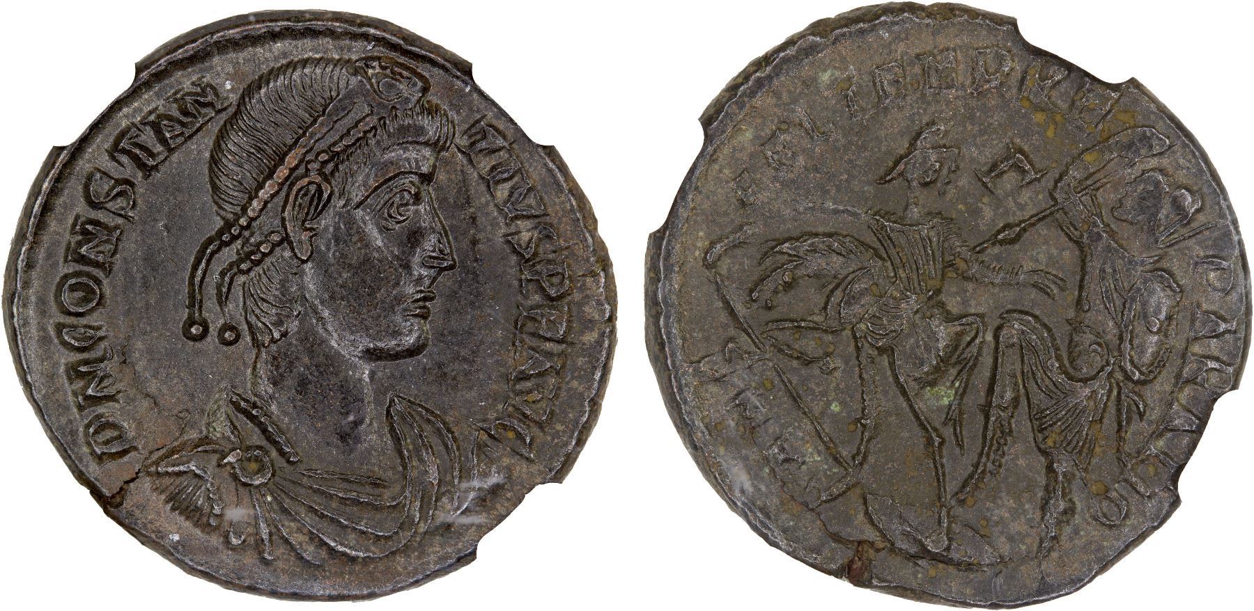 ROMAN EMPIRE: Constantius II, 337-361 AD, BI centenionalis (5.46g), Cyzicus, 351-354 AD, RIC-93, rosette-diademed, draped, and cuirassed bust right, D N CONSTANTIVS P F AVG // soldier advancing left, spearing fallen horseman wearing eastern headdress with right hand and wearing shield on left arm, shield on ground to right, FEL TEMP REPARATIO, SMKS in exergue, glossy brown patina, Strike 4/5, Surface 4/5, NGC graded AU.