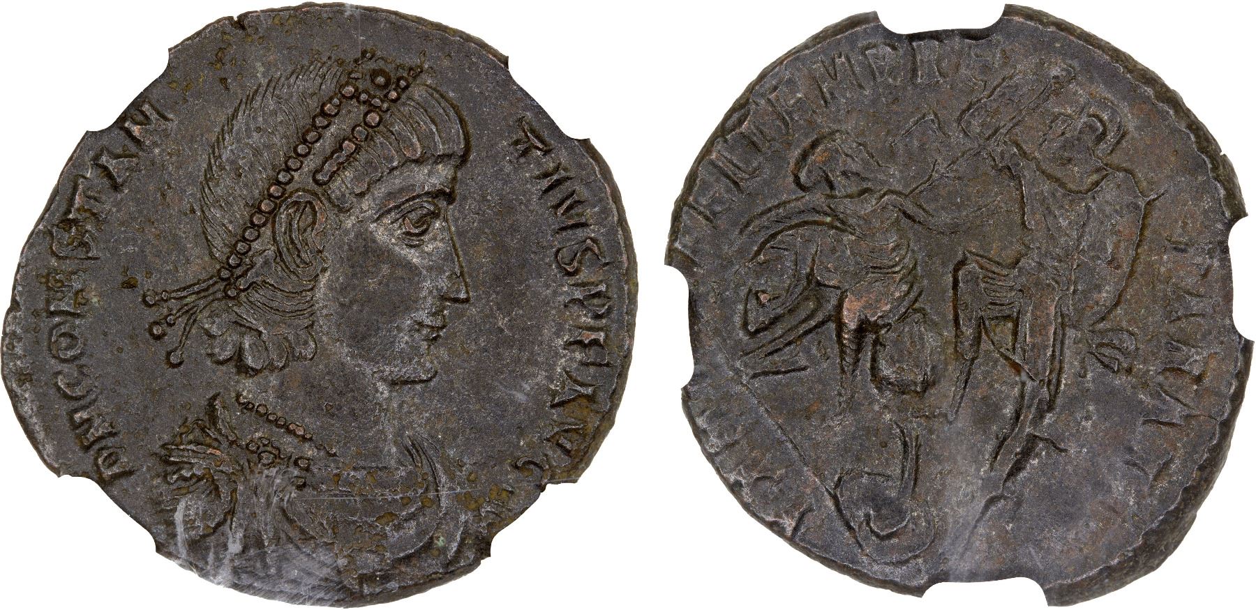 ROMAN EMPIRE: Constantius II, 337-361 AD, BI centenionalis (5.88g), Cyzicus, 351-354 AD, RIC-92/5, pearl-diademed, draped, and cuirassed bust right, D N CONSTANTIVS P F AVG // soldier advancing left, spearing fallen horseman wearing eastern headdress with right hand and wearing shield on left arm, shield on ground to right, Γ in left field, FEL TEMP REPARATIO, SMKA in exergue, light porosity, Strike 3/5, Surface 4/5, NGC graded AU.