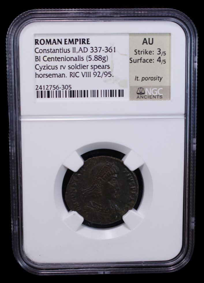 ROMAN EMPIRE: Constantius II, 337-361 AD, BI centenionalis (5.88g), Cyzicus, 351-354 AD, RIC-92/5, pearl-diademed, draped, and cuirassed bust right, D N CONSTANTIVS P F AVG // soldier advancing left, spearing fallen horseman wearing eastern headdress with right hand and wearing shield on left arm, shield on ground to right, Γ in left field, FEL TEMP REPARATIO, SMKA in exergue, light porosity, Strike 3/5, Surface 4/5, NGC graded AU.