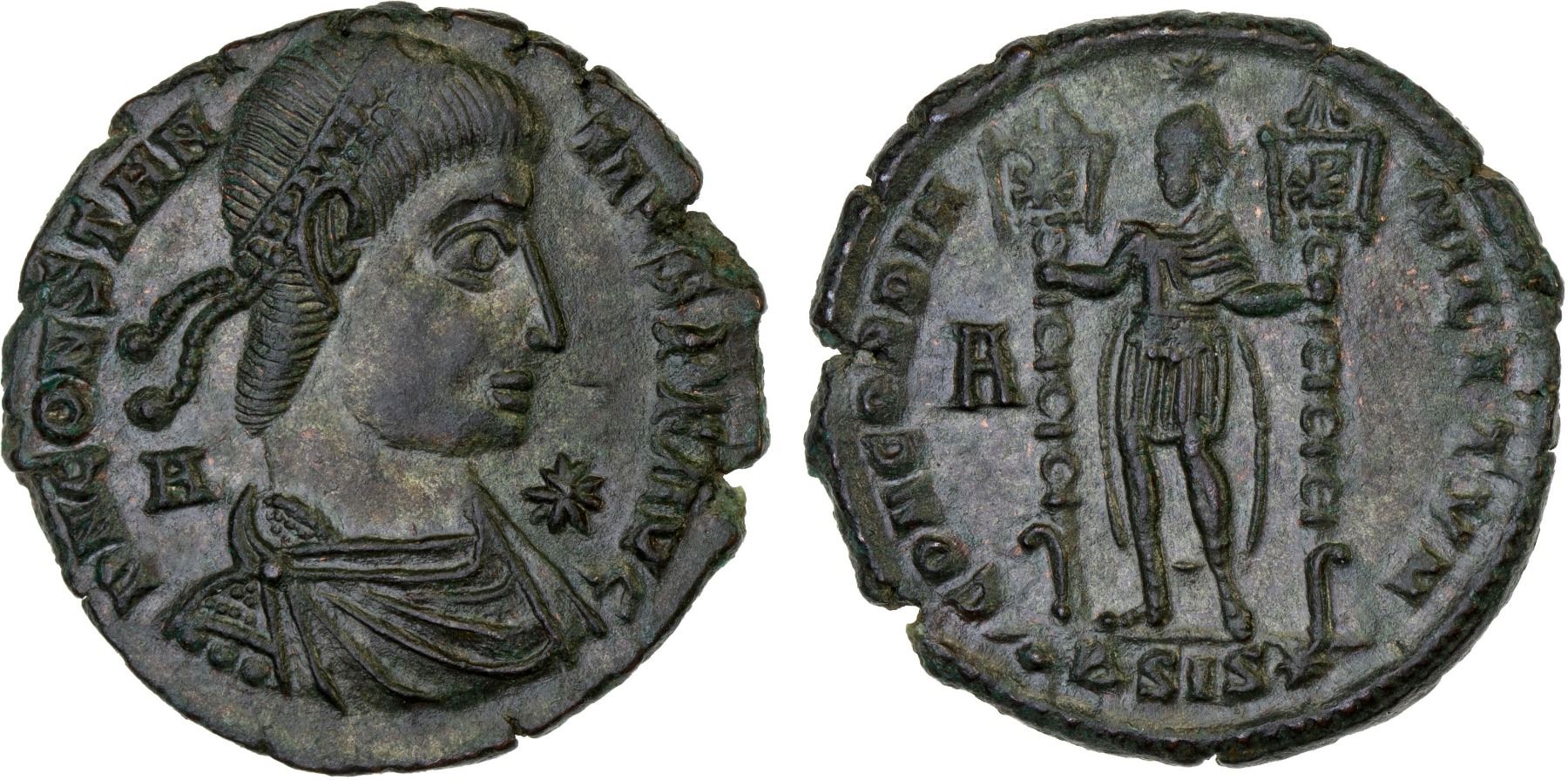 ROMAN EMPIRE: Constantius II, 337-361 AD, silvered AE centenionalis (5.64g), Siscia, 350 AD, RIC-289, struck under Vetranio, 2nd officina, pearl-diademed, draped, and cuirassed bust right; A to left, star to right, D N CONSTANTINVS P F AVG // emperor standing facing with head left, holding labarum with christogram in each hand, star above, A in left field, CONCORDIA MILITVM.SIS* in exergue, with traces of original silvering, beautiful light luster, XF-AU, ex James Lamb Collection.