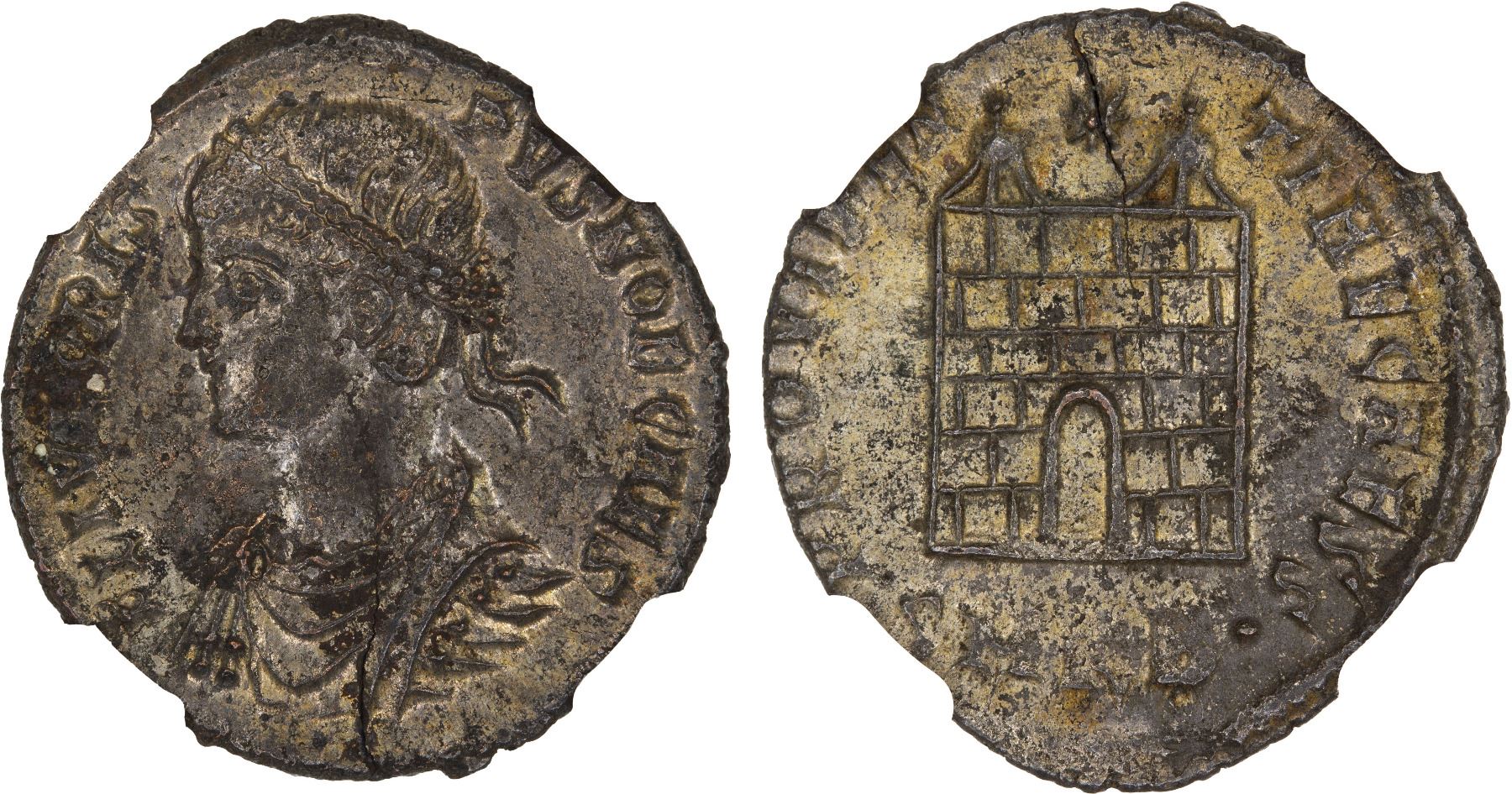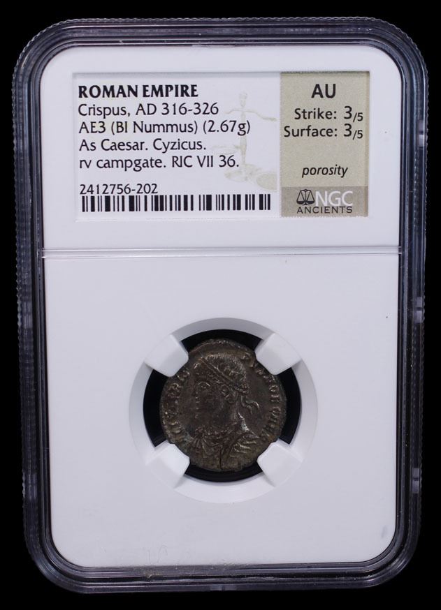 ROMAN EMPIRE: Crispus, caesar, 317-326 AD, silvered AE3 (2.67g), Cyzicus, 325-326 AD, RIC-36, laureate, draped, and cuirassed bust right, FL IVL CRISPVS NOB CAES // camp gate with two turrets, star above, PROVIDENTIAE CAESS, SMKA* in exergue, light porosity, silvering largely intact and lightly lustrous, Strike 3/5, Surface 3/5, NGC graded AU.