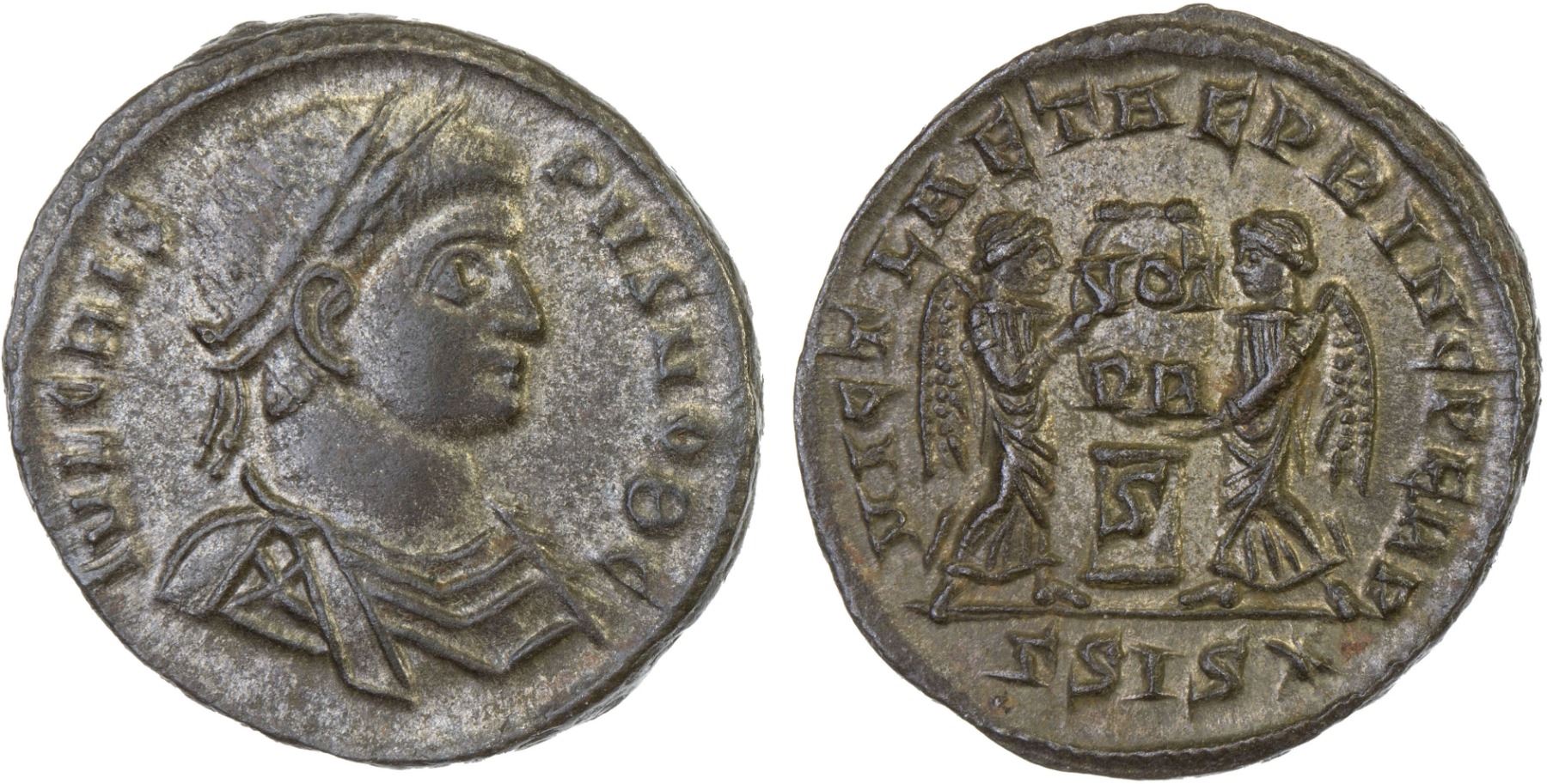 ROMAN EMPIRE: Crispus, caesar, 317-326 AD, silvered AE3 (2.97g), Siscia, 319-310 AD, RIC-97, laureate, draped, and cuirassed bust right, IVL CRISPVS NOB C // two Victories holding shield inscribed VOT/PR above altar inscribed S, ΓSIS* in exergue, much of silvering intact, lovely light luster, Choice XF, ex James Lamb Collection.