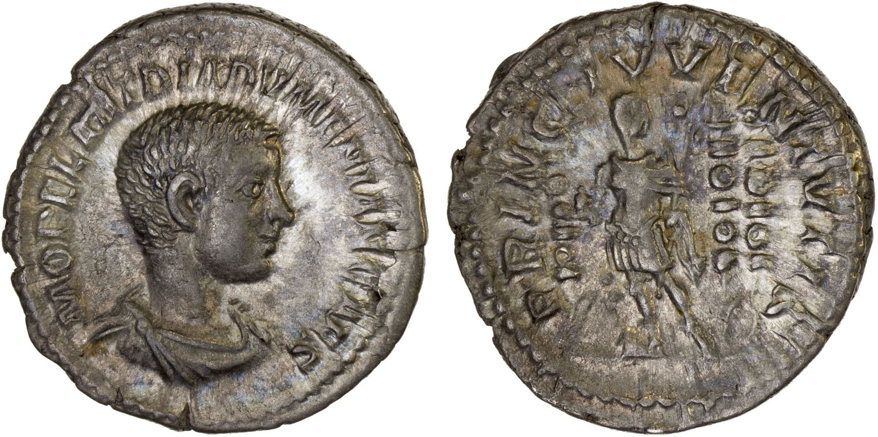 ROMAN EMPIRE: Diadumenian, as caesar, 217-218 AD, AR denarius (3.44g), Rome, RIC-102b (Macrinus), bareheaded, draped, and cuirassed bust right, M OPEL ANT DIADVMENIAN CAES // Diadumenian standing facing with head right, holding standard in right hand and scepter in left hand, two standards to right, each surmounted by eagle, PRINC IVVENTVTIS, beautiful light luster, XF.