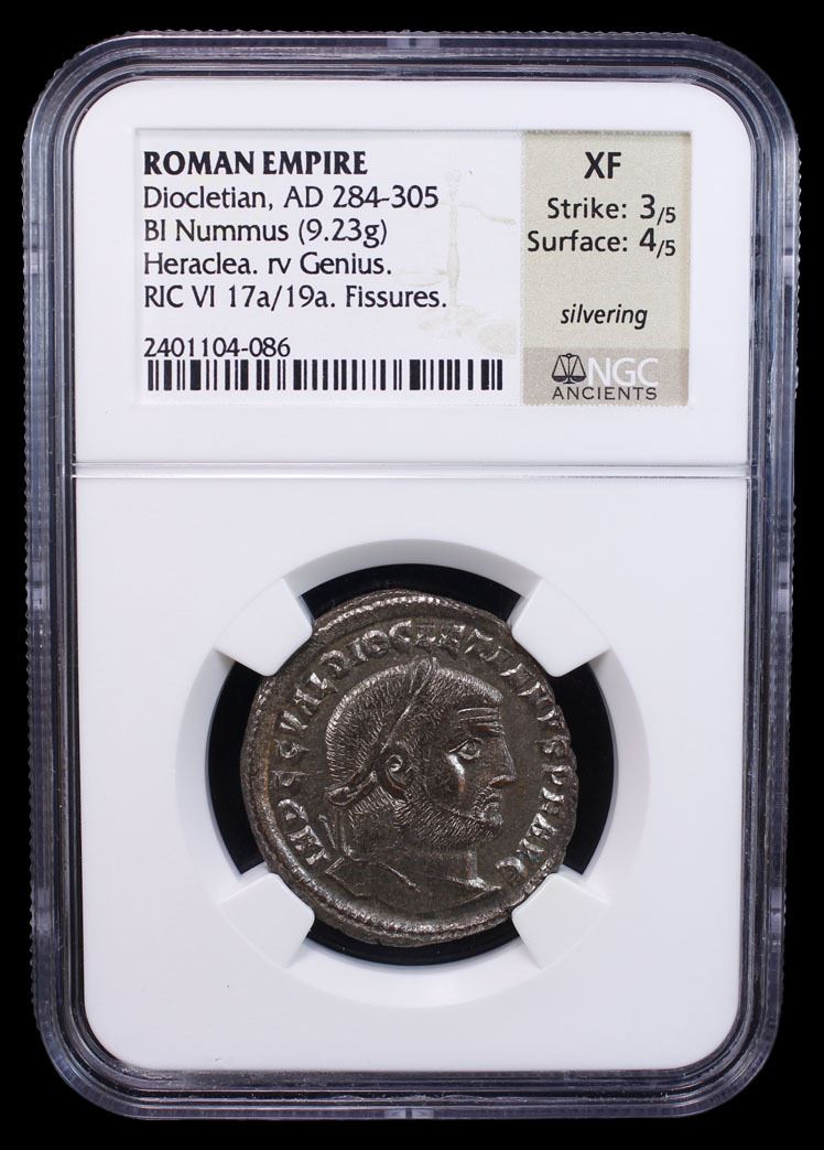ROMAN EMPIRE: Diocletian, 284-305 AD, silvered BI nummus (9.23g), Heraclea, RIC-17a/19a, laureate head right, IMP C C VAL DIOCLETIANVS P F AVG // Genius standing left, pouring liquid from patera in right hand and holding cornucopia in left hand, GENIO POPVLI ROMANI, HTE in exergue, intact silvering with attractive light luster, a few faint surface fissures, Strike 3/5, Surface 4/5, NGC graded XF.