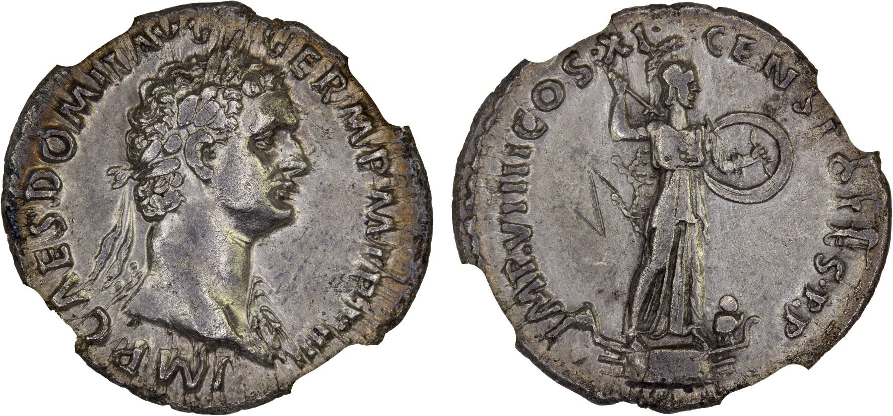 ROMAN EMPIRE: Domitian, 81-96 AD, AR denarius (3.06g), Rome, 85 AD, NGC Choice VF