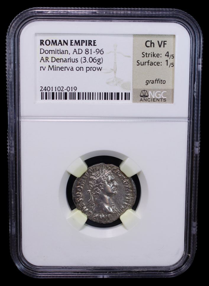 ROMAN EMPIRE: Domitian, 81-96 AD, AR denarius (3.06g), Rome, 85 AD, RIC-328, laureate head right, aegis on right shoulder, IMP CAES DOMIT AVG GERM P M TR P IIII // Minerva standing right on top of rostral column, holding spear and shield; owl standing to her right, IMP VIIII COS XI CENS POTES P P, graffito on reverse, faint hairlines, some peripheral luster, Strike 4/5, Surface 1/5, NGC graded Choice VF.