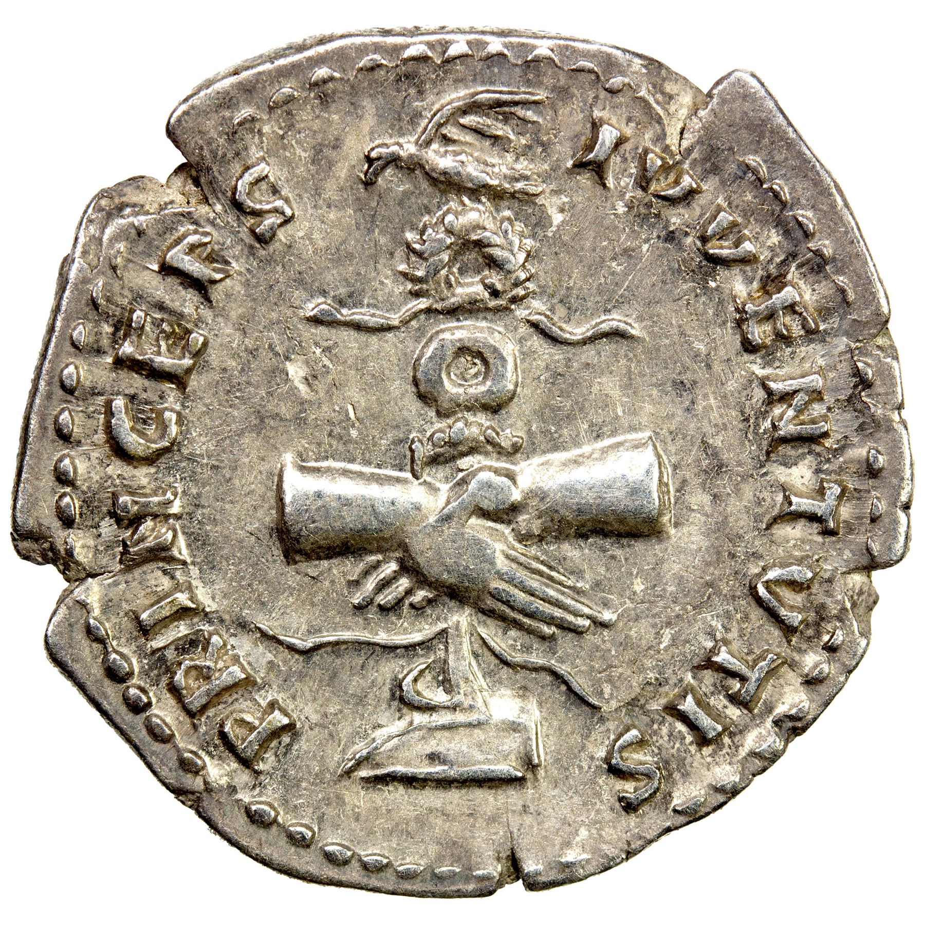 ROMAN EMPIRE: Domitian, as caesar, 69-81 AD, AR denarius (3.39g), Rome, 79 AD, RIC-246 (Vespasian), RSC-393, laureate head right, CAESAR AVG F DOMITIANVS COS VI // clasped hands holding aquila on prow, PRINCEPS IVVENTVTIS, pleasing bright surface, choice VF.