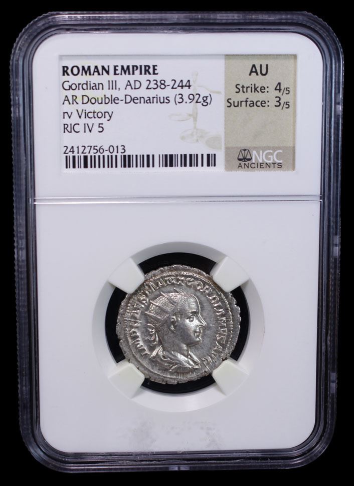 ROMAN EMPIRE: Gordian III, 238-244 AD, AR antoninianus (3.92g), Rome, 238-239 AD, RIC-5, radiate, draped, and cuirassed bust right, IMP CAES M ANT GORDIANVS AVG // Victory advancing left, raising wreath in right hand and carrying palm on left shoulder, VICTORIA AVG, lightly lustrous, Strike 4/5, Surface 3/5, NGC graded AU.