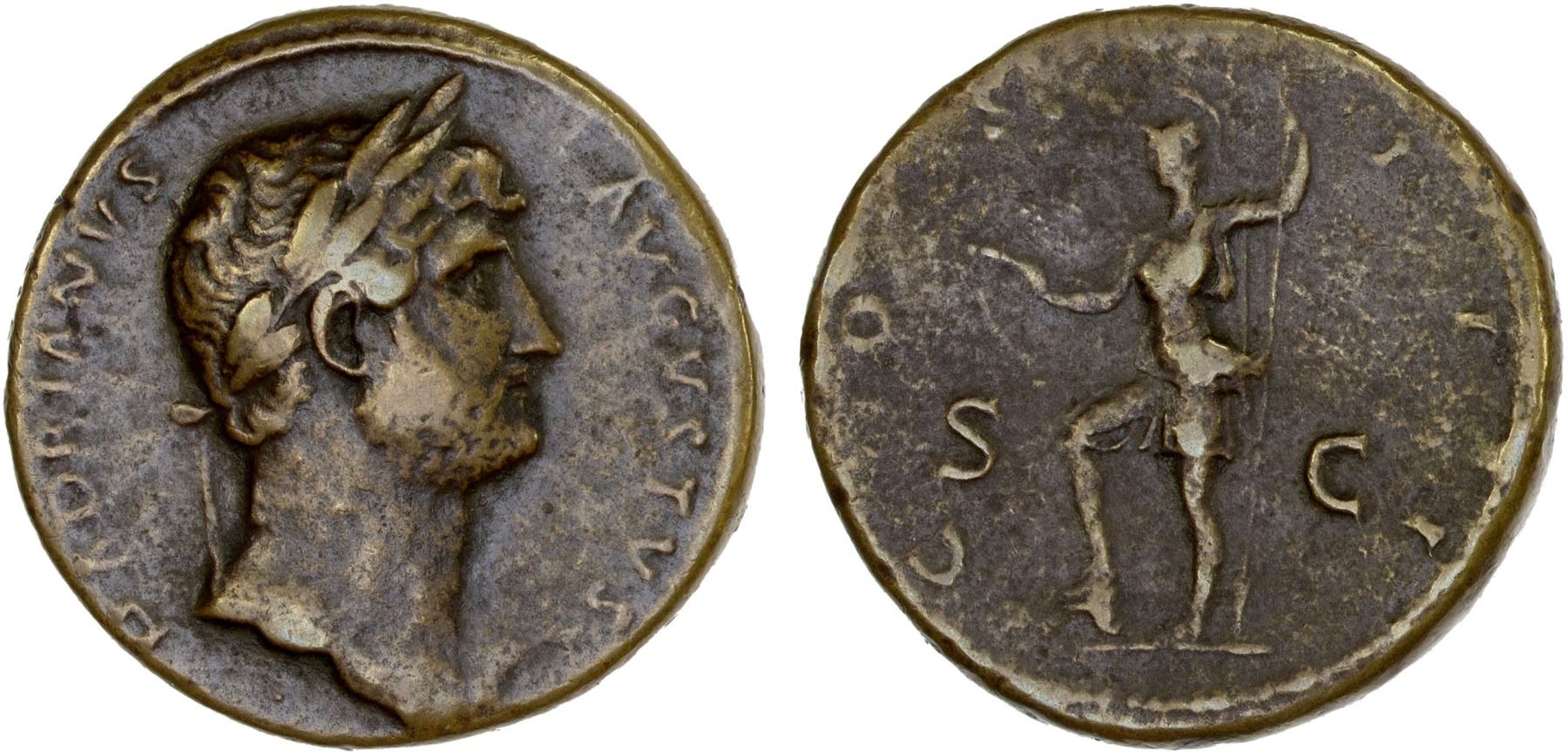 ROMAN EMPIRE: Hadrian, 117-138 AD, AE sestertius (26.39g), Rome, 124-128 AD, RIC-638, laureate head right, HADRIANVS AVGVSTVS // Virtus standing left with left foot on helmet, holding parazonium and inverted spear, attractive brassy patina, F-VF.