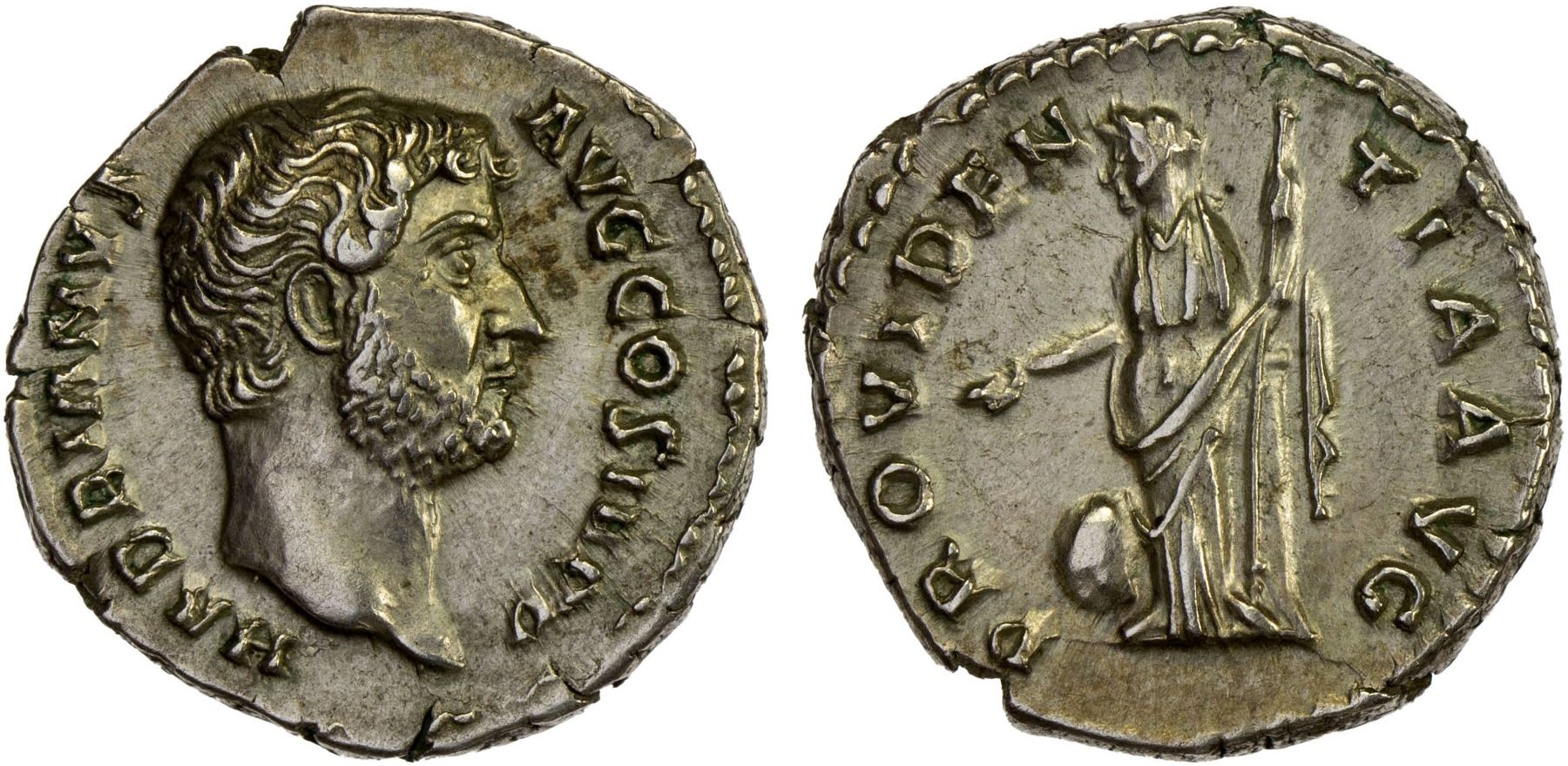 ROMAN EMPIRE: Hadrian, 117-138 AD, AR denarius (3.50g), Rome, 137-138 AD, RIC-2320, bare head right, HADRIANVS AVG COS III P P // Providentia standing left, holding out right hand and holding scepter with left hand, globe at her feet, column to right, PROVIDENTIA AVG, lovely strike, XF, ex Dr. Vincent John Adams Flynn Collection (Noble Numismatics Sale 110, Lot 2813).