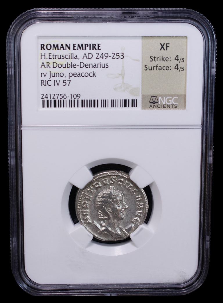 ROMAN EMPIRE: Herennia Etruscilla, augusta, 249-251, AR antoninianus, Rome, RIC-57 (Trajan Decius), diademed and draped bust right, set on crescent, HER ETRVSCILLA AVG // Juno standing left, holding patera in right hand and scepter in left hand, peacock standing to left, IVNO REGINA, Strike 4/5, Surface 4/5, NGC graded XF.