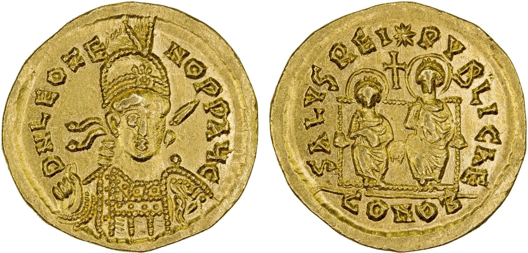 ROMAN EMPIRE: Leo II & Zeno, 474, AV solidus (4.47g), Constantinople, S-21470, D N LEO ZENO PP AVG, helmeted and cuirassed bust, holding spear and shield with horseman motif // SALVS REI PVBLICAE, Leo II (on left) and Zeno (on right) enthroned facing, each nimbate, diademed and wearing imperial mantle, mappa in right hands, cross above, lightly rough surfaces, XF, R. Leo II, grandson of Leo I, was born in 467 and named Caesar in October 473, elevated to the rank of Augustus shortly before his grandfather's death. Following grandfather's death, he was named sole emperor of the East on 18 January 474. Because of his weak health and inability to perform the imperial requisites he was made co-emperor with Zeno on 9 February 474. His health full to increasing illness and he died on or about 17 November 474. Zeno became the sole emperor of the East later that same day. Two years later, in 476, the West was effectively lost to the Roman Empire.