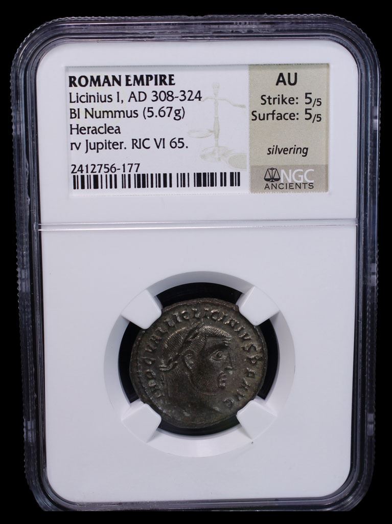ROMAN EMPIRE: Licinius I, 308-324 AD, silvered BI nummus (5.67g), Heraclea, 312 AD, RIC-56, laureate head right, IMP C VAL LIC LICINIVS P F AVG // Jupiter standing left, holding globe in right hand and long scepter with left hand, wreath to lower left, IOVI CONSERVATORI, HTG in exergue, silvering intact and lightly lustrous, Strike 5/5, Surface 5/5, NGC graded AU.
