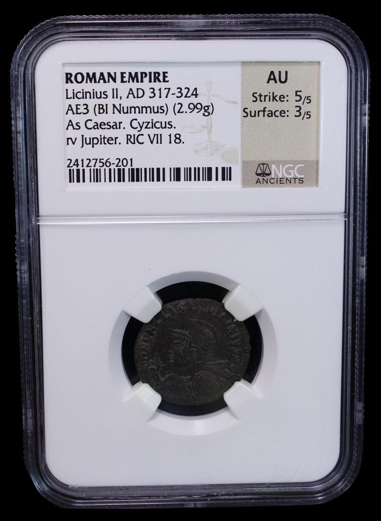 ROMAN EMPIRE: Licinius II, caesar, 317-324 AD, AE3 (2.99g), Cyzicus, 321-324 AD, RIC-18, helmeted and cuirassed bust left, holding spear across right shoulder and shield on left arm, D N VAL LICIN LICINIVS NOB C // Jupiter standing left, holding Victory on globe in right hand and eagle-tipped scepter in left hand, eagle with wreath to left, captive to right, IOVI CONSERVATORI, SMKB in exergue, Strike 5/5, Surface 3/5, NGC graded AU.