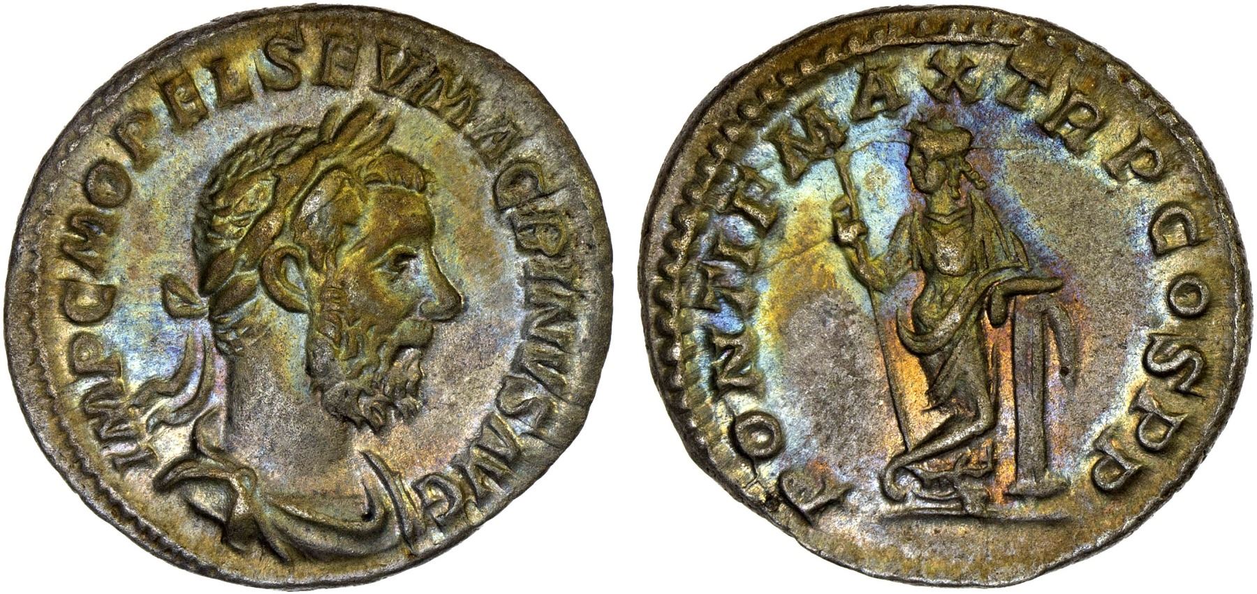 ROMAN EMPIRE: Macrinus, 217-218 AD, AR denarius (3.04g), Rome, 217 AD, RIC-24c, laureate, draped, and cuirassed bust right, IMP CM OPEL SEV MACRINVS AVG // Securitas standing left, holding scepter in right hand and resting left arm on column, multicolored toning, slight roughness, with traces of original luster, XF.