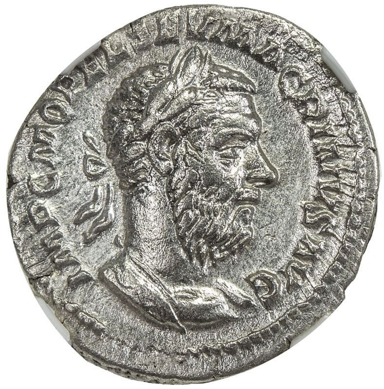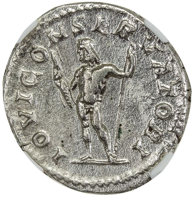 ROMAN EMPIRE: Macrinus, 217-218 AD, AR denarius (3.10g), S-7338, IOVI CONSERVATORI, Jupiter standing left, with scepter and thunderbolt, strike 5/5, surface 2/5, NGC graded Choice EF.