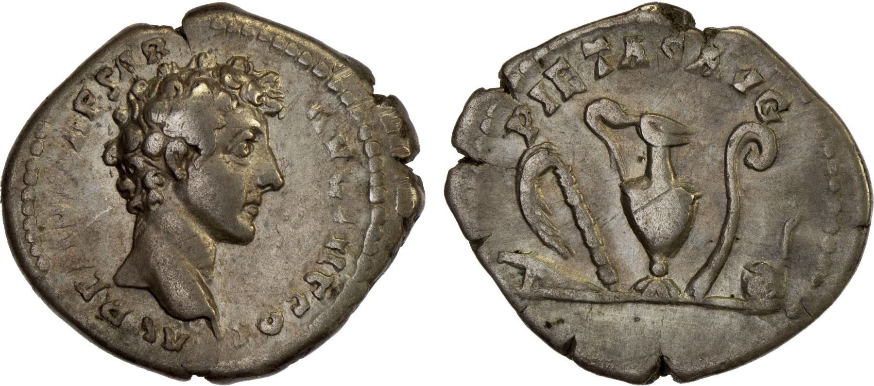 ROMAN EMPIRE: Marcus Aurelius, as caesar, 139-161 AD, AR denarius (3.23g), Rome, 140-144 AD, RIC-424A, bare head right, AVRELIVS CAESAR AVG PII F COS // emblems of the pontificate (knife, sprinkler, jug, lituus, and simpulum), PIETAS AVG, faint scratches and hairlines, F-VF, ex James Lamb Collection.