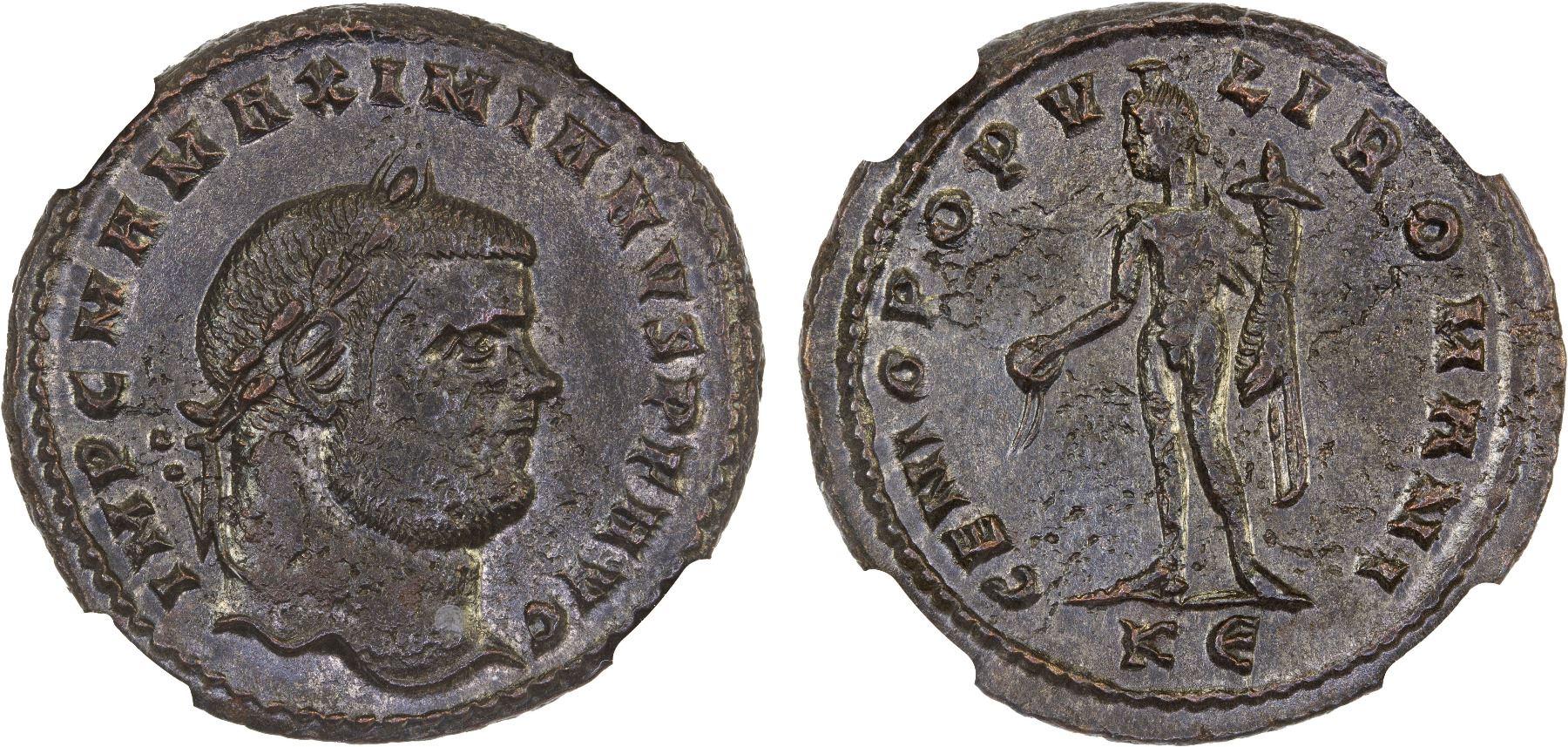 ROMAN EMPIRE: Maximian, 286-310 AD, BI nummus (9.57g), Cyzicus, RIC-10b, laureate head right, IMP C M A MAXIMIANVS P F AVG // Genius standing left, pouring liquid from patera in right hand and holding cornucopia in left hand, GENIO POPVLI ROMANI, KE in exergue, light surface porosity and fissures, lightly lustrous, Strike 4/5, Surface 2/5, NGC graded VF.