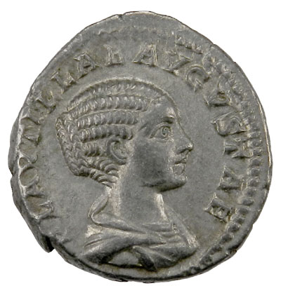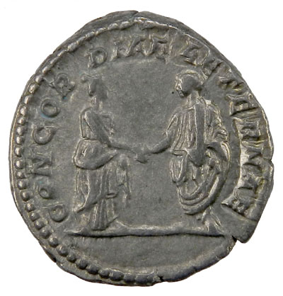 ROMAN EMPIRE: Plautilla, Augusta 202-212, AR denarius (3.42g), RIC-361, S-7069, RSC-10, wife of Caracalla, struck 202 AD, PLAVTILLAE AVGVSTAE, draped bust right / CONCORDIAE AETERNAE, Plautilla & Caracalla clasping hands, choice Extremely Fine to About Uncirculated.