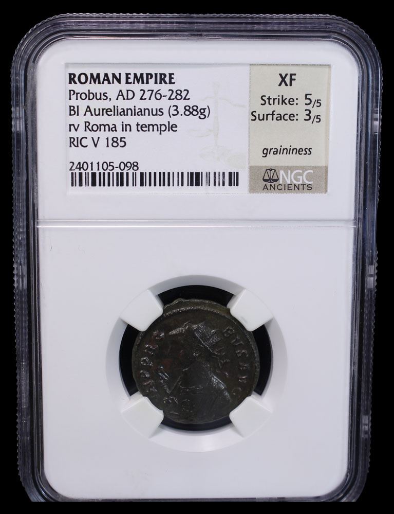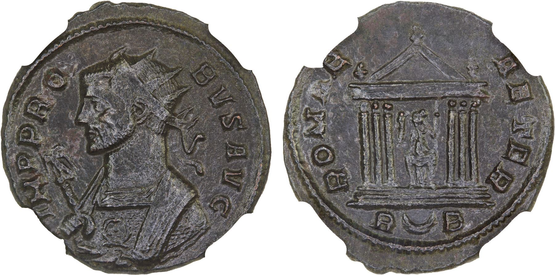 ROMAN EMPIRE: Probus, 276-282 AD, BI antoninianus (3.88g), Rome, RIC-185, radiate bust left, wearing imperial mantle, holding eagle-tipped scepter in right hand, IMP PROBVS AVG // hexastyle temple, Roma seated within, holding Victory in right hand and scepter in left hand, ROMAE AETER, R [crescent] B in exergue, slight graininess, glossy dark patina, Strike 5/5, Surface 3/5, NGC graded XF.