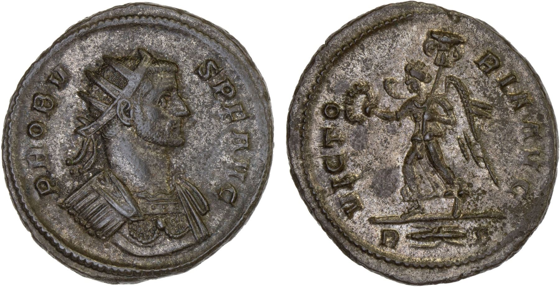 ROMAN EMPIRE: Probus, 276-282 AD, silvered AE antoninianus (4.02g), Rome, RIC-215, radiate and cuirassed bust right, PROBVS P F AVG // Victory advancing left, holding wreath in right hand and trophy in left hand, VICTORIA AVG, R [winged thunderbolt] ς in exergue, with much silvering intact, XF, ex James Lamb Collection.