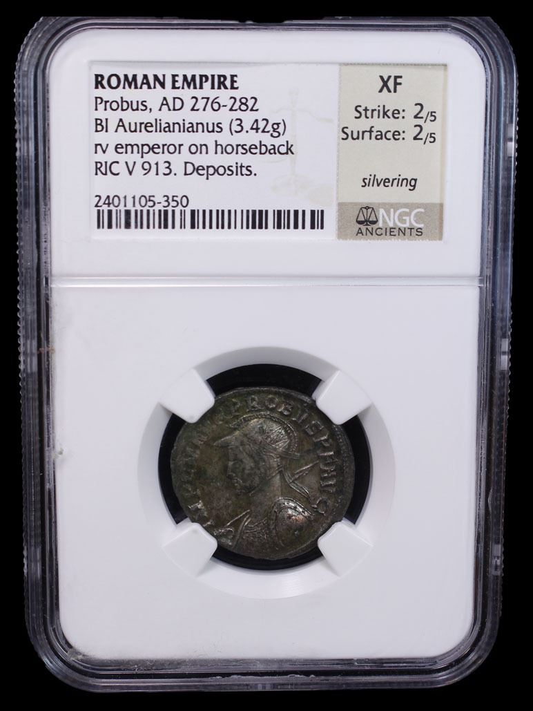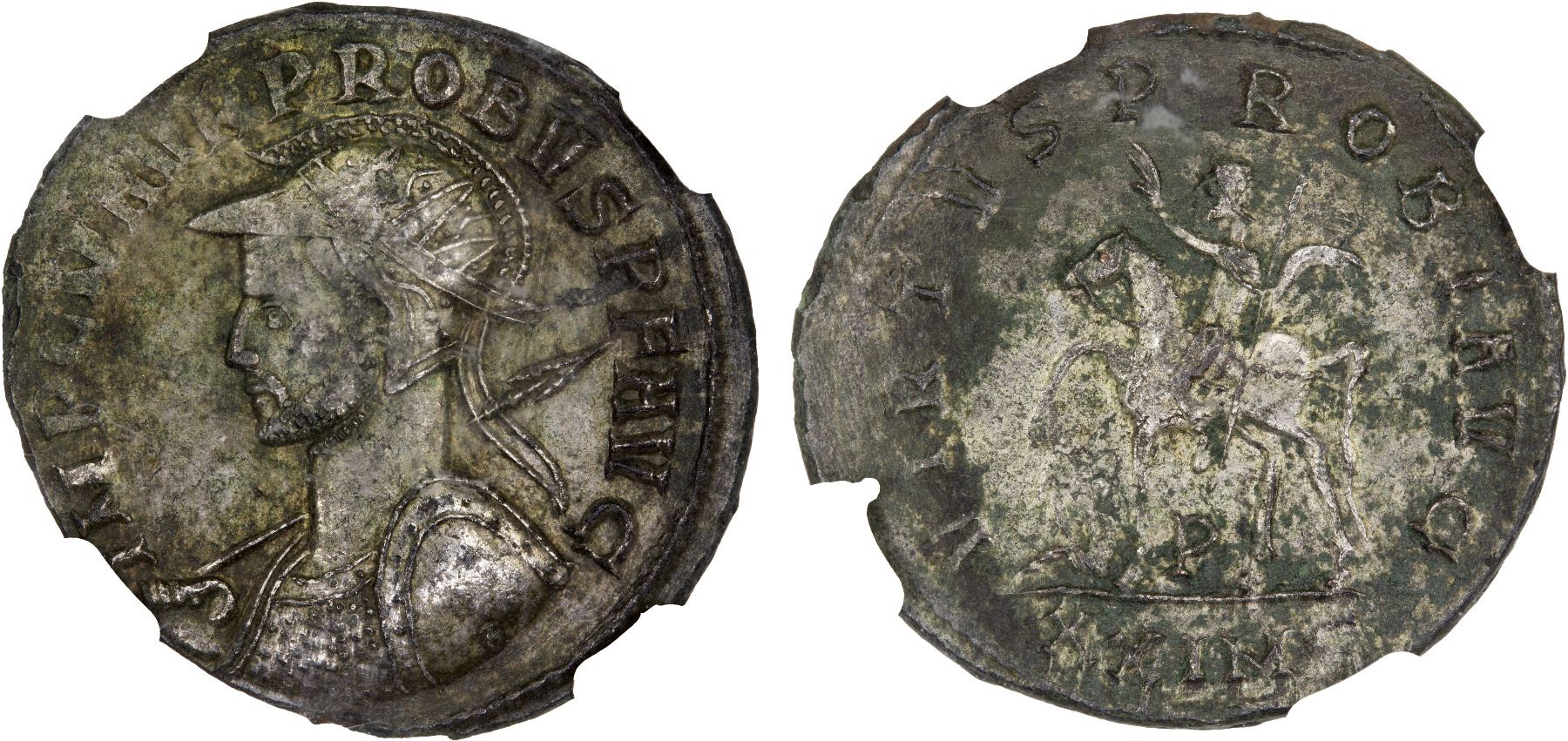ROMAN EMPIRE: Probus, 276-282 AD, silvered BI antoninianus (3.42g), Cyzicus, RIC-913, helmeted and cuirassed bust left, holding spear in right hand and shield in left hand, IMP C M AVR PROBVS P F AVG // Probus on horseback left, raising right hand and holding scepter in left hand, captive seated below to left, VIRTVS PROBI AVG, P below, XXIMC in exergue, silvering largely intact, light deposits, Strike 2/5, Surface 2/5, NGC graded XF.