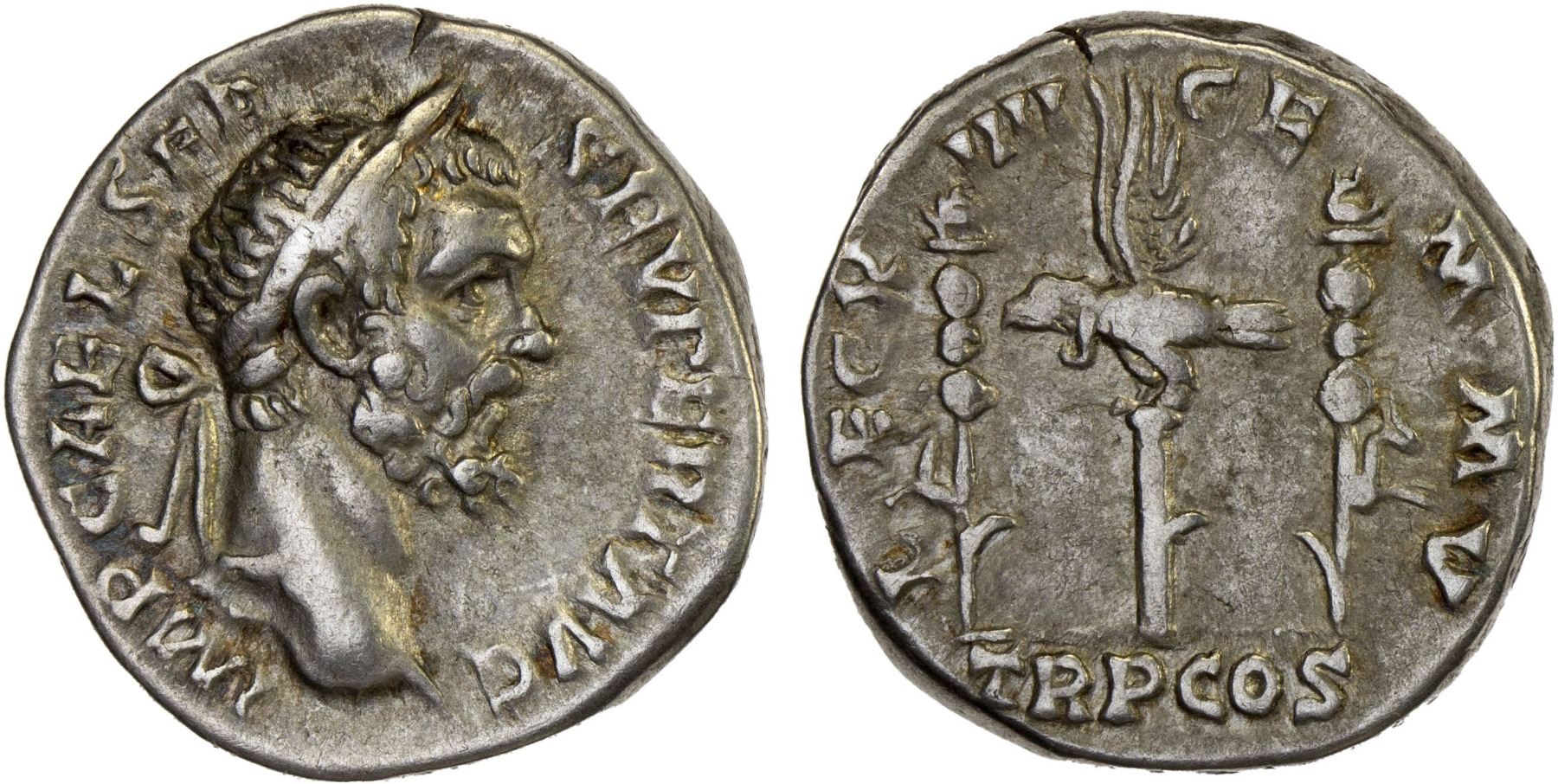 ROMAN EMPIRE: Septimius Severus, 193-211 AD, AR denarius (3.07g), Rome, 193-194 AD, RIC-14, laureate head right, IMP CAE L SEP SEV PERT AVG // legionary eagle left, standard to either side, TR P COS in exergue, LEG XIIII GEM M V, VF, ex Dr. Vincent John Adams Flynn Collection (Noble Numismatics Sale 110, Lot 2832), ex Forvm Ancient Coins.
