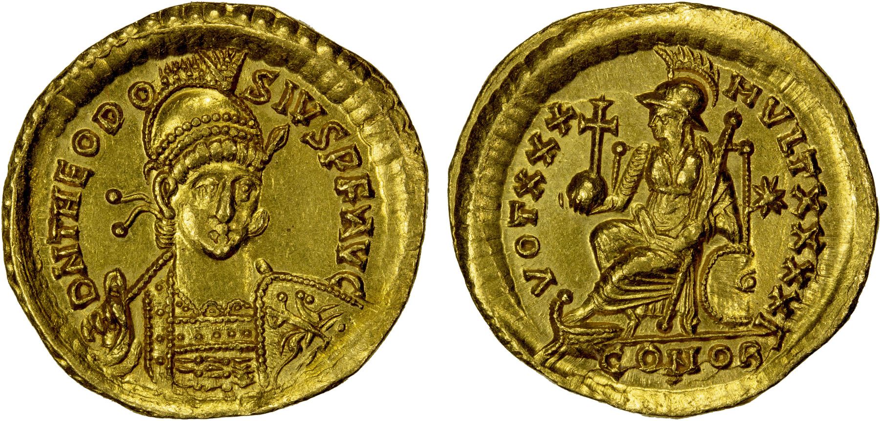 ROMAN EMPIRE: Theodosius II, 402-450 AD, AV solidus (4.47g), Constantinople, struck 430-440 AD, RIC-257, 3rd officina, helmeted, pearl-diademed and cuirassed bust facing slightly right, holding spear in right hand behind head and shield decorated with horseman on left arm, D N THEODO-SIVS P F AVG // Constantinopolis enthroned left with left foot on prow, holding cross on globe in right hand and scepter in left, shield behind throne, star in right field, VOT XXX MVLT XXXX Γ / CONOB, a few scattered hairlines, lovely lustrous surfaces, Choice About Unc.